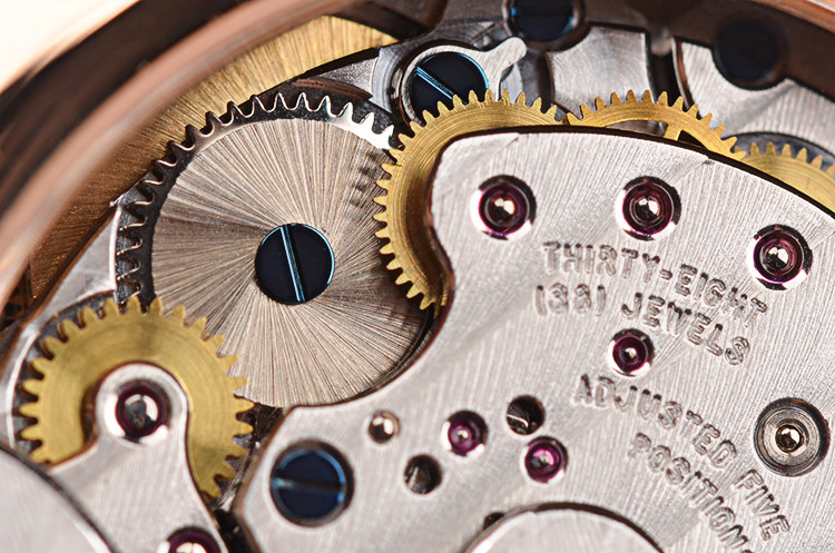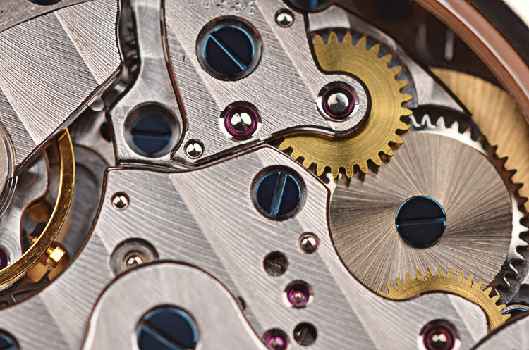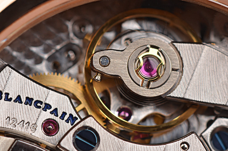 宝珀自产CAL. 1241型机芯,自动机械,高达407个零件组成,高复杂机芯,极其精致日内瓦条纹打磨,倒角抛光修饰,38钻,摆频28800,5方位校正。动力储备40小时。18K白金镌刻自动转陀。走时状态极嘉。