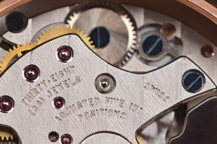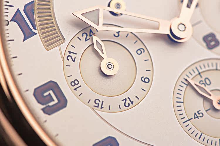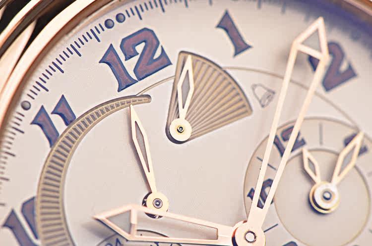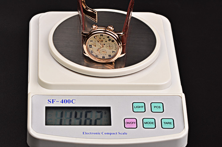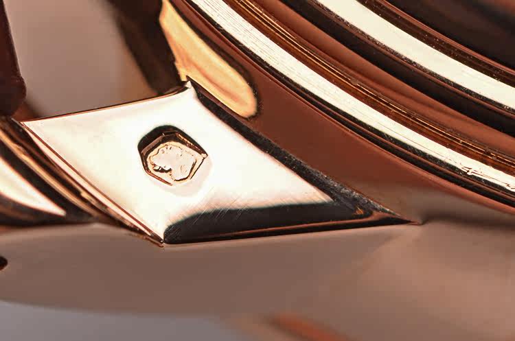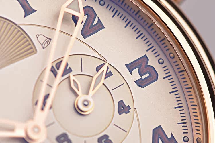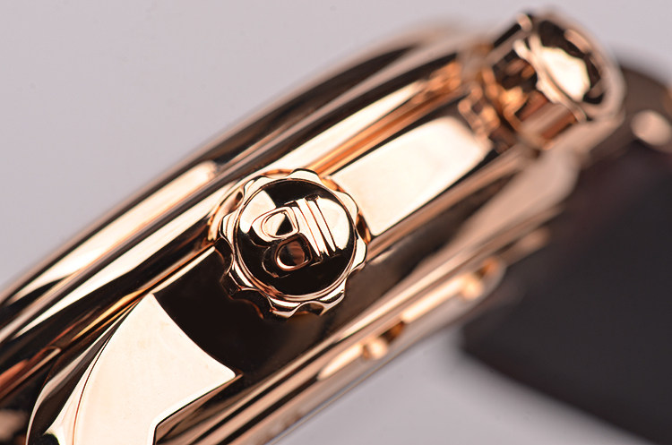 18K玫瑰金表壳及折叠式表扣,圣伯纳狗头印记。后配全新棕色鳄鱼皮表带。蓝宝石水晶镜面及底盖,立体乳白色表盘,夜光刻度及玫瑰金镂空指针,12点位闹铃开关状态显示,3点位闹铃时间显示,4点位日历显示,6点位独立小秒针,9点位第二时区时间显示,10点位指针式闹铃动力储备显示。旋入式防水表把。口径40MM*13.3MM。防水100M。