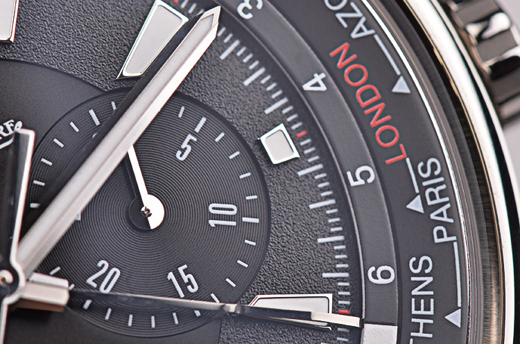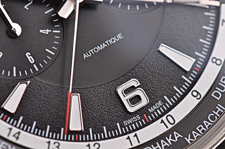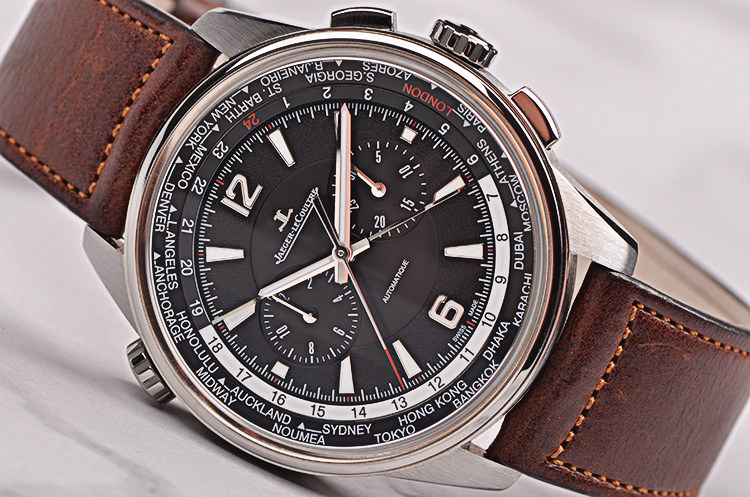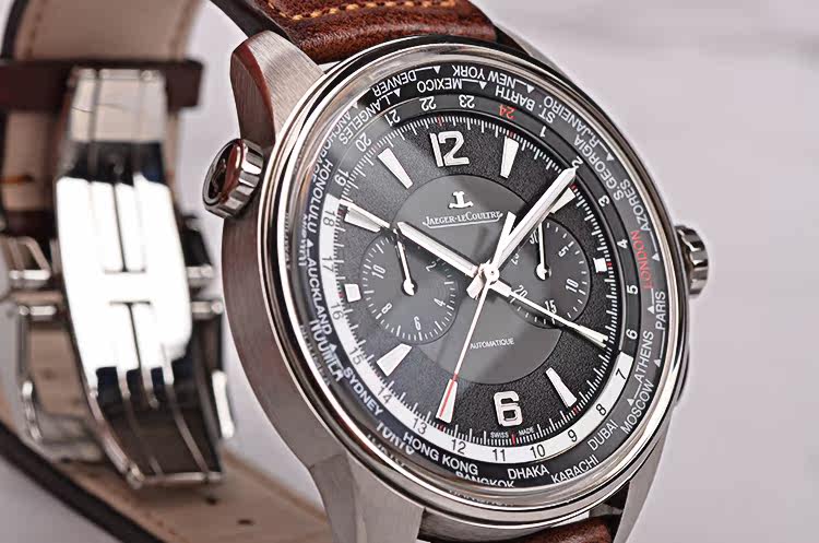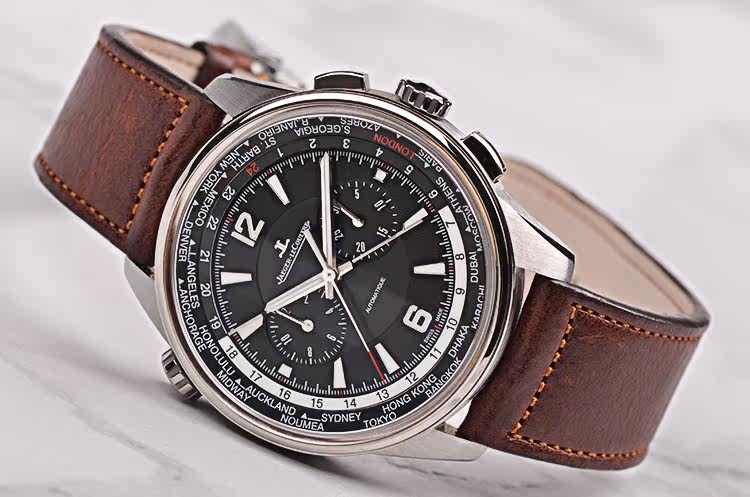 钛金属表壳,精钢折叠式表扣,原装棕色牛皮表带成色极新。蓝宝石水晶镜面及底盖,立体黑色计时表盘搭配世界时表内圈,夜光刻度及时分针,3点位30分钟计时,9点位12小时计时,昼夜分割线设计。表壳侧面10点位世界时区快调旋钮。口径44MM*12.5MM,防水100M。