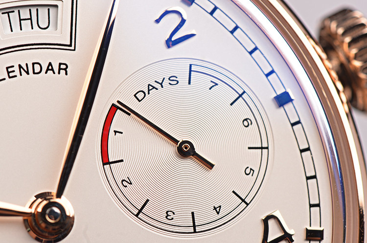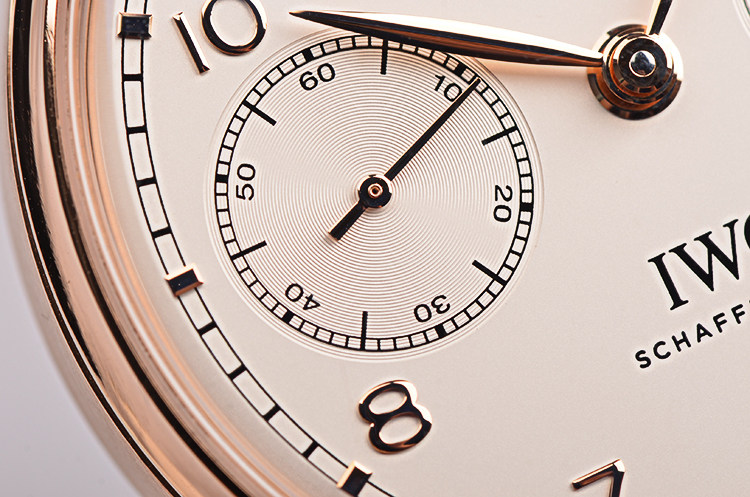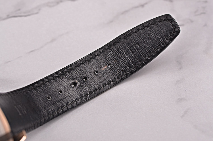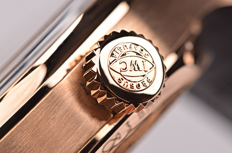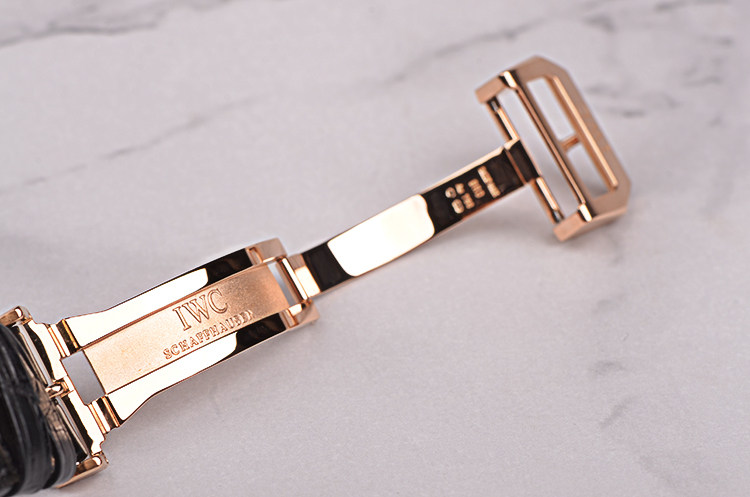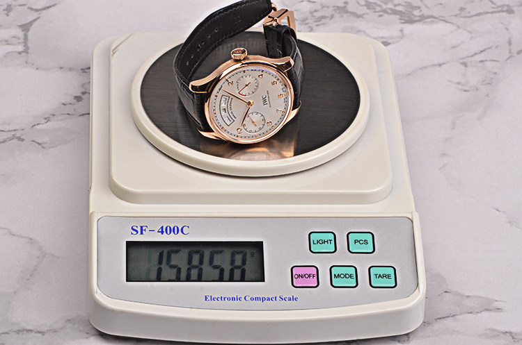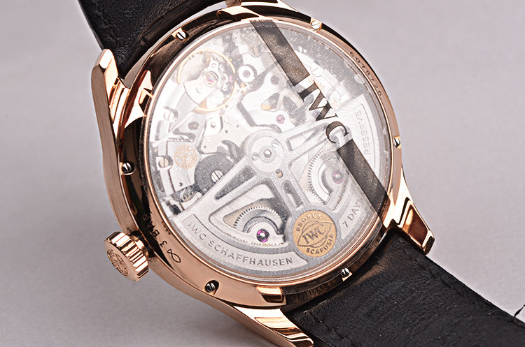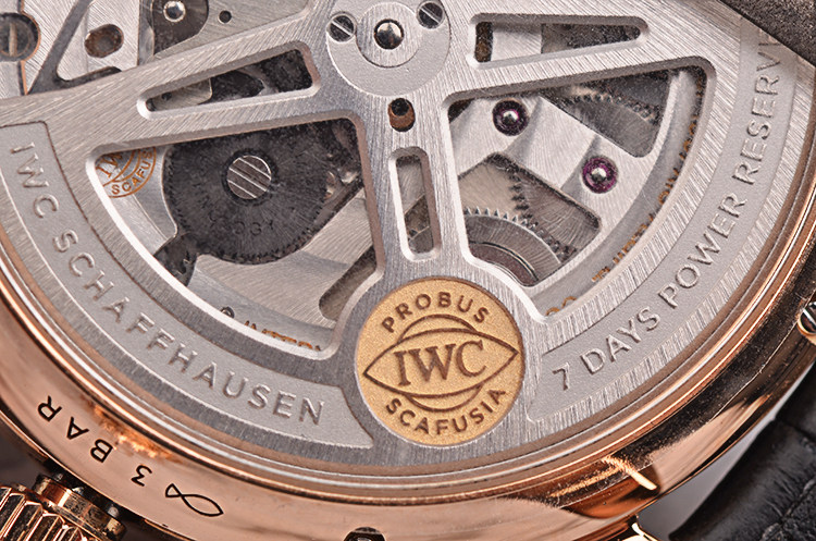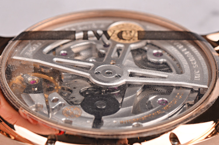 IWC自产的CAL.52850型机芯,年历自动机械,比勒顿上弦系统,七天长动力。36钻,5方位校正,摆频28800,极其精致日内瓦条纹打磨。宝玑游丝,18K金质徽章镂空自动摆陀。走时状态极嘉。