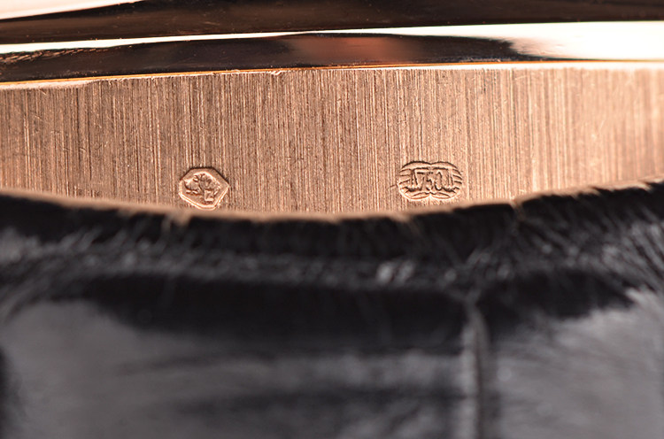 18K玫瑰金表壳及折叠式表扣,圣伯纳狗头印记。原厂黑色鳄鱼皮表带成色极新。抗反光涂层蓝宝石水晶镜面及底盖。立体银白色年历表盘,玫瑰金阿拉伯数字刻度及指针,月份,日历,星期,动力储备显示。每年只需在2月份进行调校。口径44.2MM*14.9MM。防水30M。