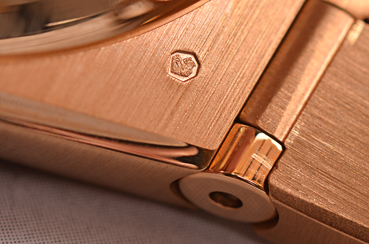 奢华18K玫瑰金表壳及链带,18K玫瑰金按压式双向折叠表扣。圣伯纳狗头印记。蓝宝石水晶镜面及底盖,18K玫瑰金罗马数字刻度表圈,立体银白色表盘,玫瑰金夜光刻度及时分针,3点位日历显示功能。口径35MM*10.7MM,防水100M。