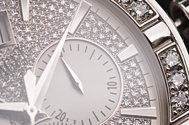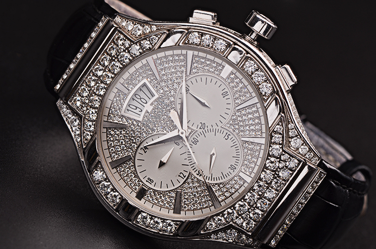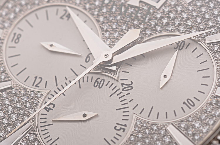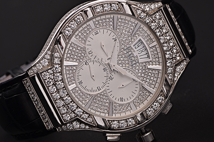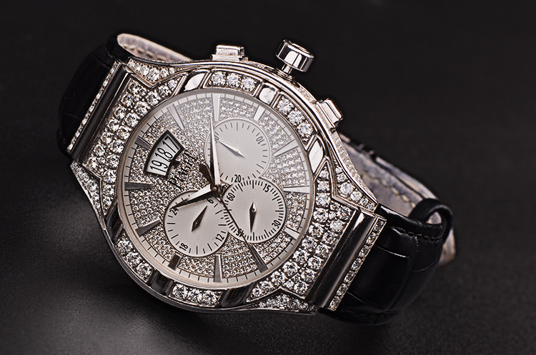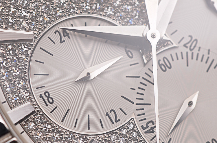 18K白金枕型表壳及折叠式表扣,圣伯纳狗头印记。原厂黑色鳄鱼皮表带成色很新。表壳、表框及表盘原厂镶嵌hao华天然美钻。蓝宝石水晶镜面及底盖,立体银白色镶钻表盘,白金指针及刻度,12点位大日历视窗,3点位30分钟计时,6点位独立小秒针,9点位指针式第二时区显示。口径43MM*11.1MM,旋入式防水表冠,防水50M。