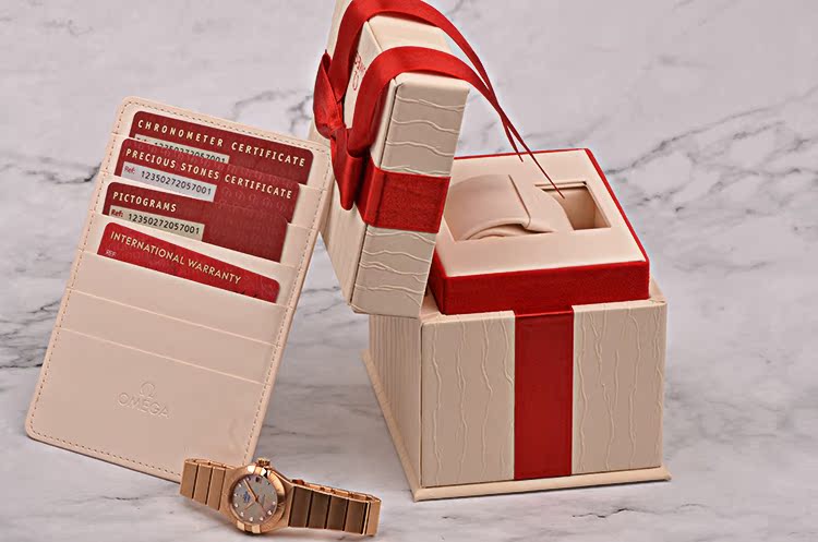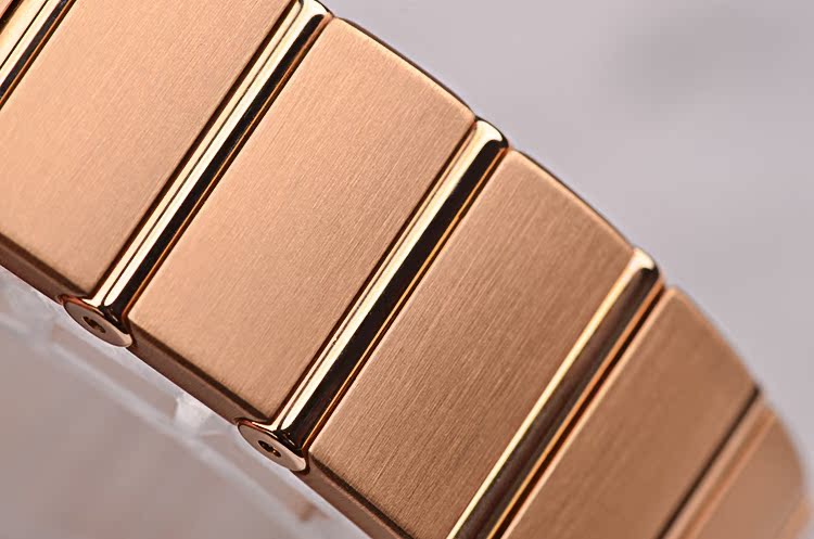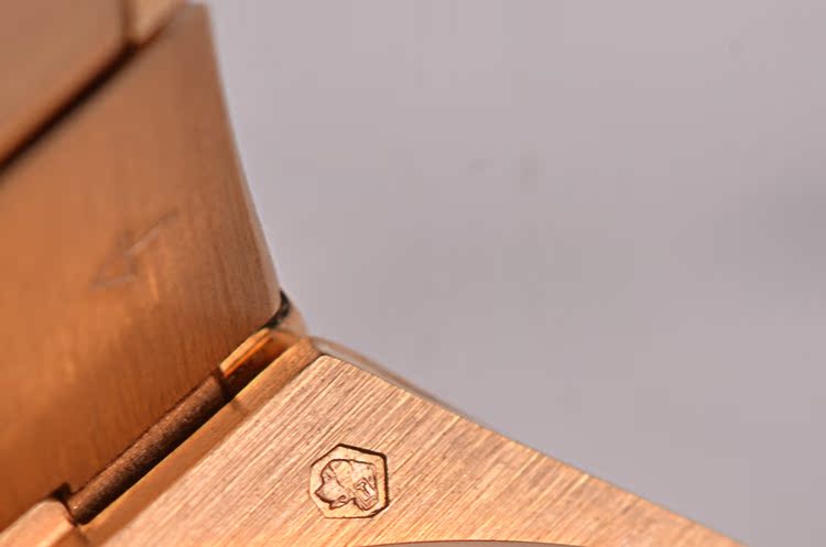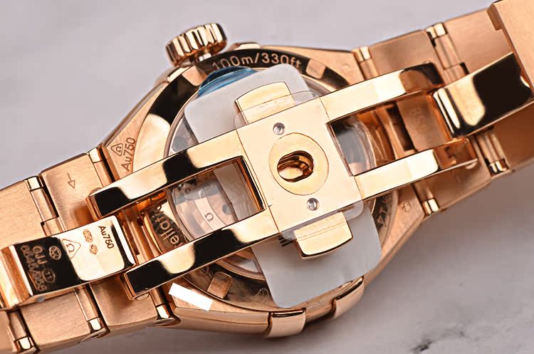 奢华18K玫瑰金表壳及链带,按压式双向折叠表扣,圣伯纳狗头印记。蓝宝石水晶镜面,18K玫瑰金罗马数字表圈,立体棕色珍珠贝母表盘,11颗原厂VVS级钻石时标(共计约0.12克拉),玫瑰金夜光时分针,3点位日历窗口,口径27MM*12.3MM,防水30M。