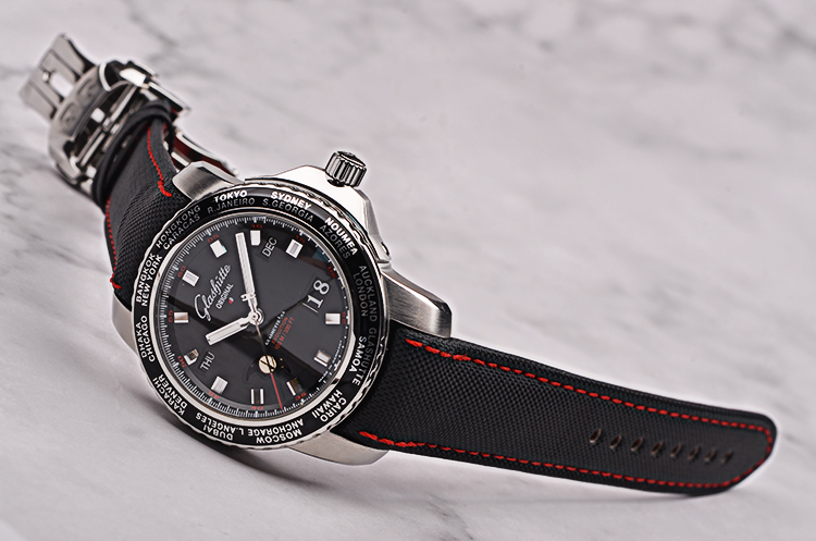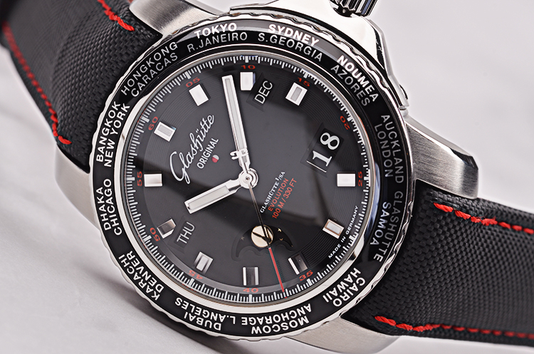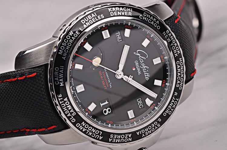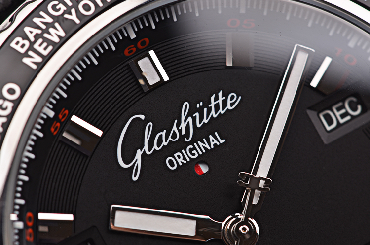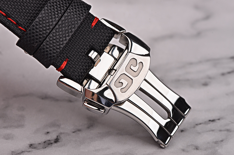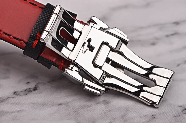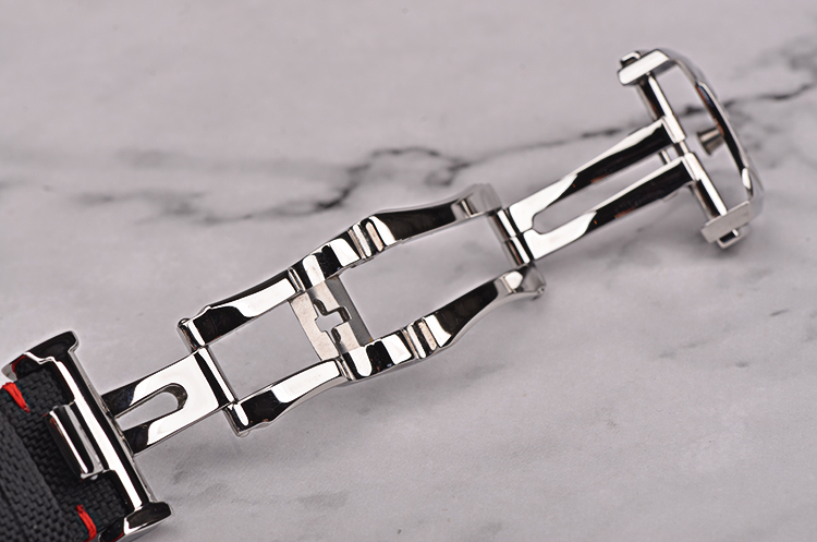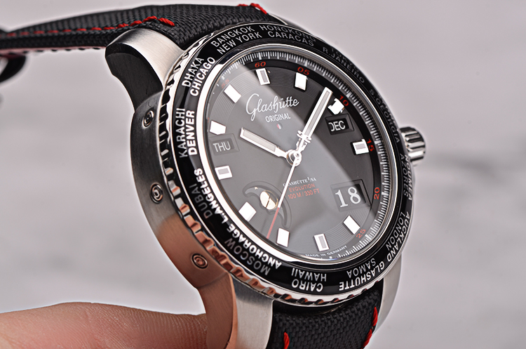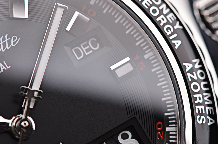 精钢表壳及按压式双向折叠表扣,后配全新黑色尼龙外衬皮带。蓝宝石水晶镜面及底盖,可旋转黑色精钢世界时表圈,立体黑色万年历表盘,夜光刻度及时分针,12点位红、黄、黑、白四色圆孔用作闰年识别,2点位月份显示,4点位大日历窗口,7至8点位月相显示,10点位星期显示。表壳侧面有对应各项功能的调校孔。口径42.5MM*14.5MM。旋入式防水锁把,防水100M。