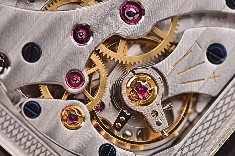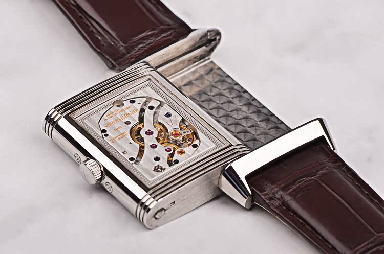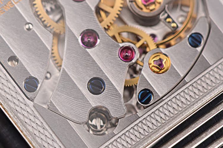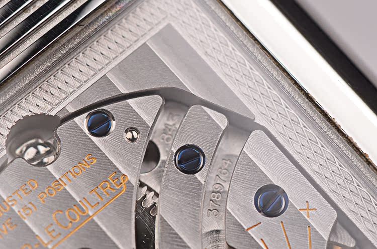 积家自产的CAL.843型机芯,手动机械,极其精致日内瓦条纹打磨,倒角抛光修饰。由231个零件组成,5方位校正,21钻,摆频21600,动力储存约45小时,走时状态极嘉。