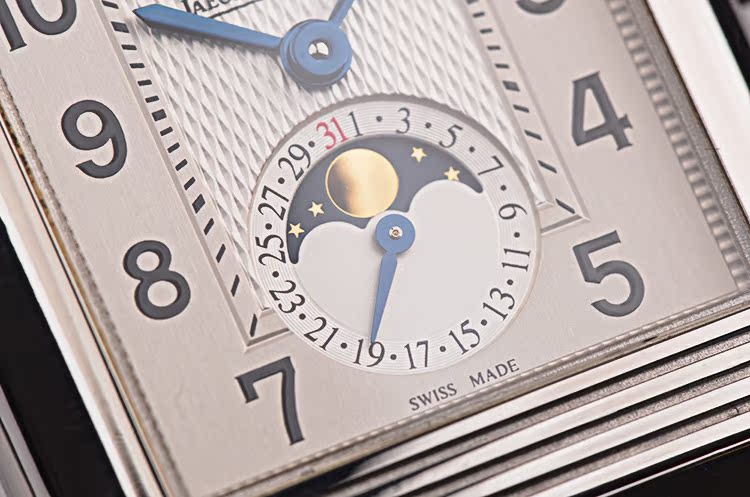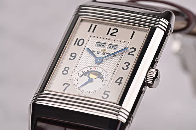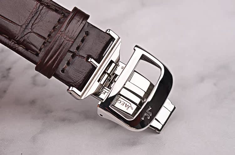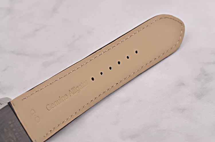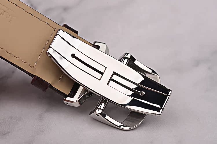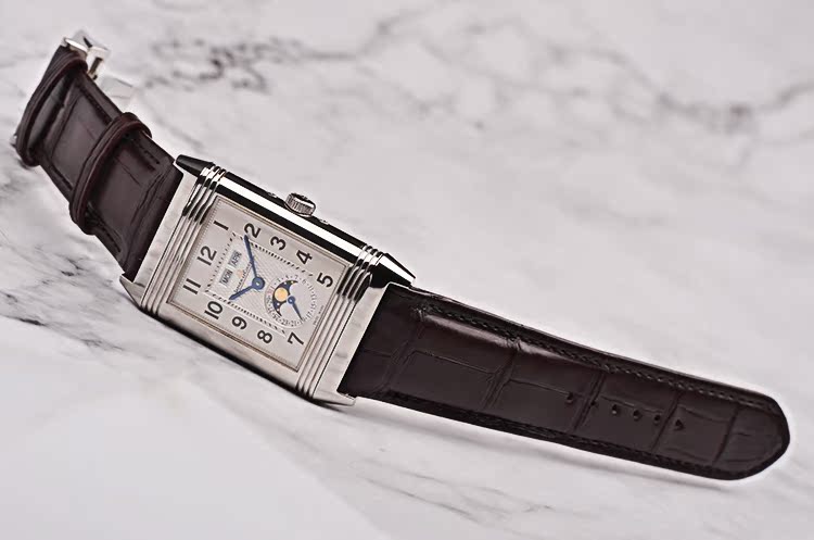 精钢表壳及双向折叠式表扣,后配全新深棕色鳄鱼皮表带。蓝宝石水晶镜面及底盖,立体银白色表盘,蓝钢指针,全历,月相功能,小三针。口径48.5MM*29.5MM*10.2MM。相当于圆表41MM左右大小。防水30M。