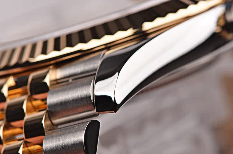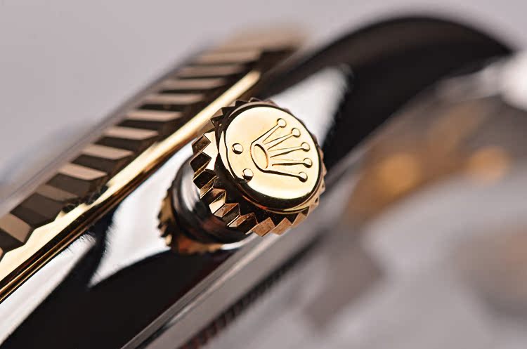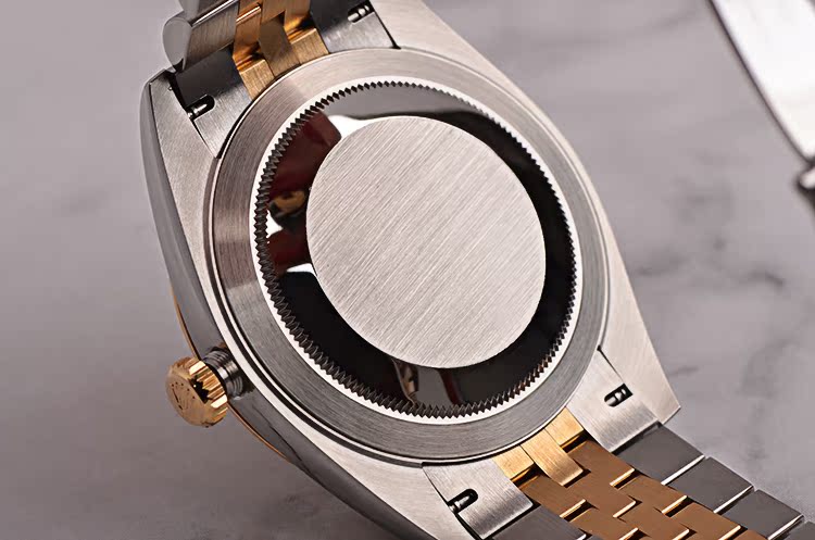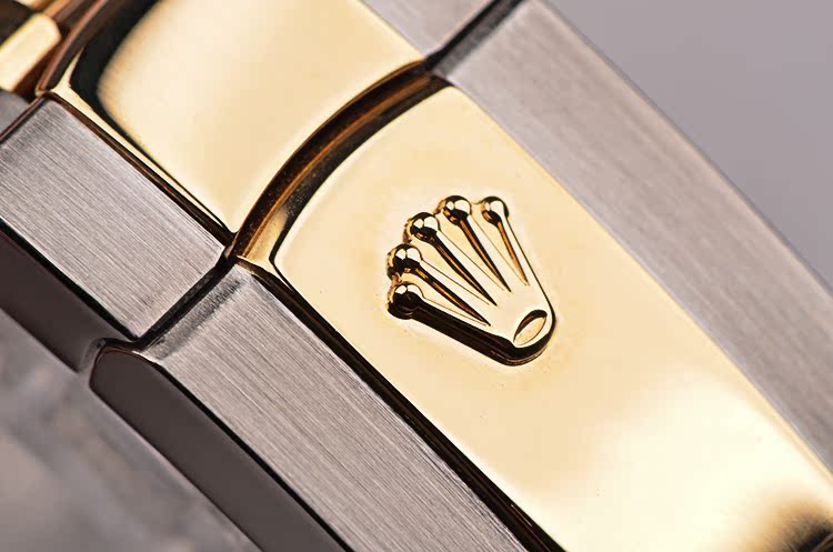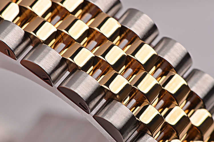 904L精钢及18K黄金表壳及链带,18K黄金三角坑纹表圈,折叠式搭扣。蓝宝石水晶镜面,立体金色面盘,黄金夜光刻度及指针,3点位放大镜日历视窗。旋入式防水表冠。口径41MM*12.8MM,防水100M。