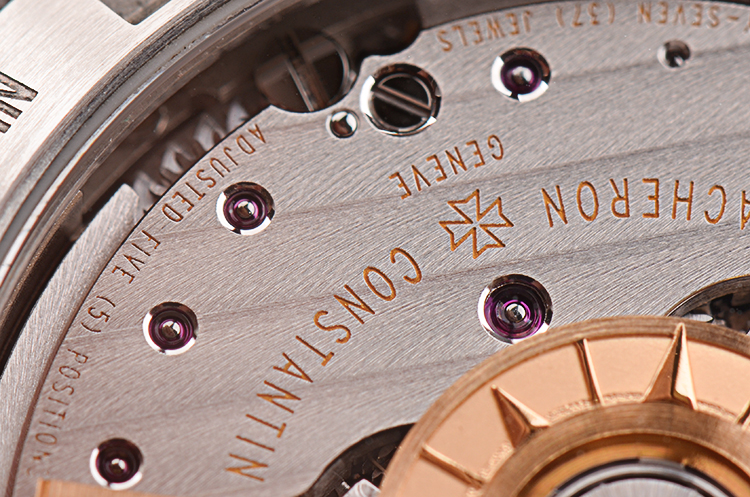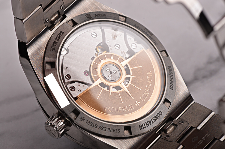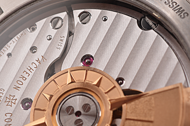 VC自产CAL.5100型新款机芯,自动机械,极其精致日内瓦条纹打磨,倒角抛光修饰,日内瓦印记,由172个零件组成,37钻,摆频28800,5方位校正,22K黄金镌刻自动转陀,动力储存约60小时,走时状态极嘉。