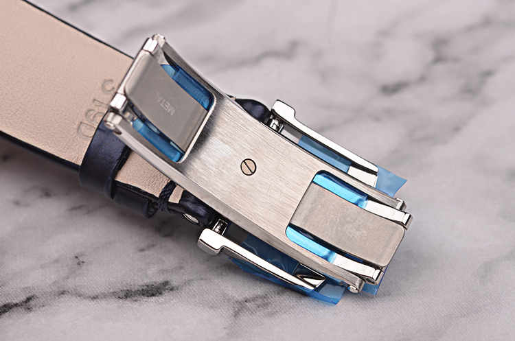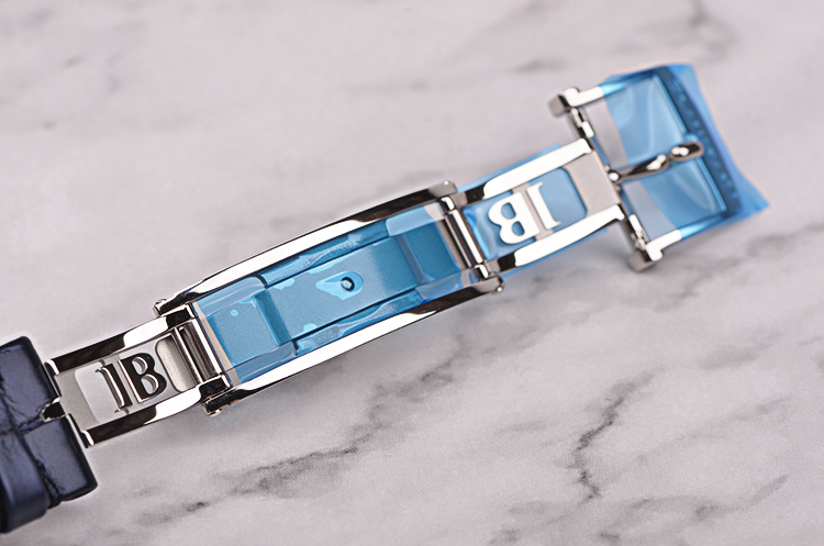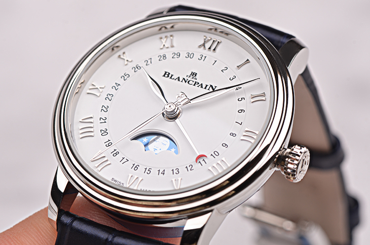 精钢表壳及双向弹簧折叠式表扣,全新原厂蓝色鳄鱼皮表带。蓝宝石水晶镜面及底盖,立体白色表盘,罗马数字刻度及柳叶时分针,月牙形日历指针,6点位经典人脸月相。口径33.2MM*10.2MM。防水30M。