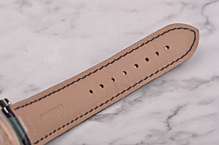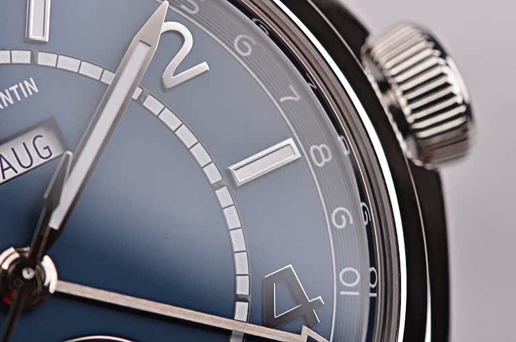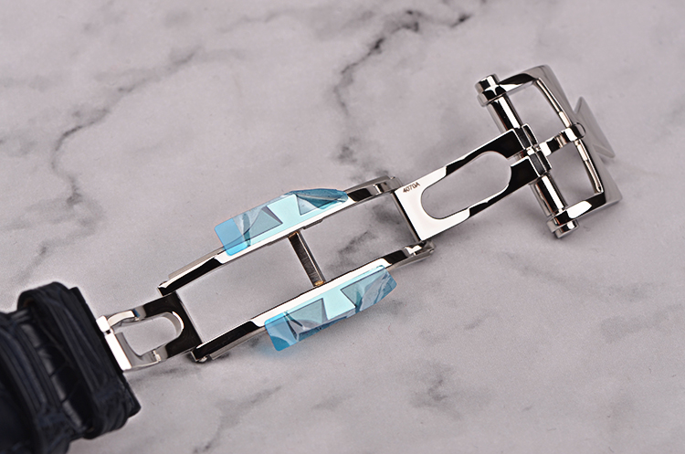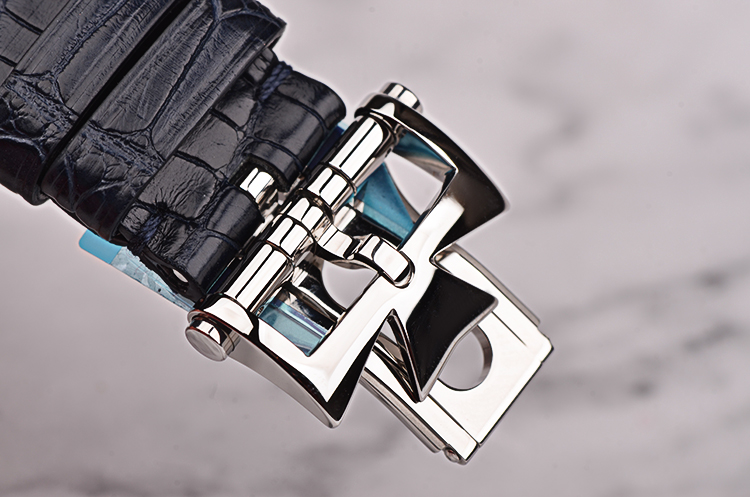 精钢表壳及按压式双向折叠表扣,深蓝色鳄鱼皮表带。蓝宝石水晶镜面及底盖,立体蓝色表盘,夜光刻度及时分针,星期、月份及月相显示,指针式日历。表壳侧面有对应各项功能的调教孔。口径40MM*11.6MM,防水30M。