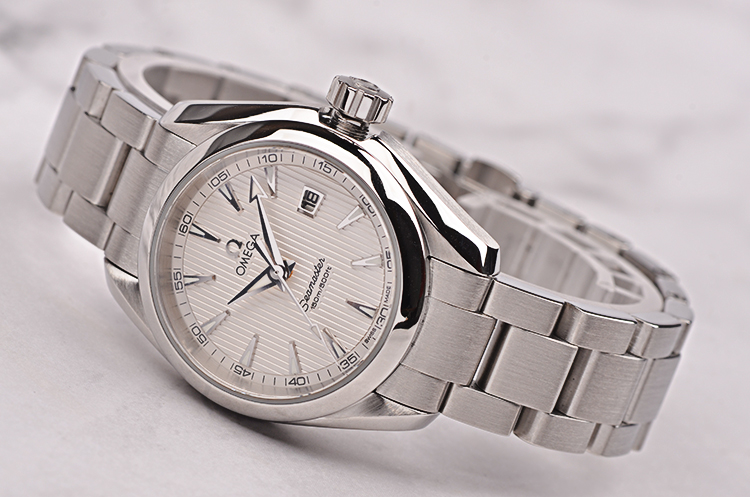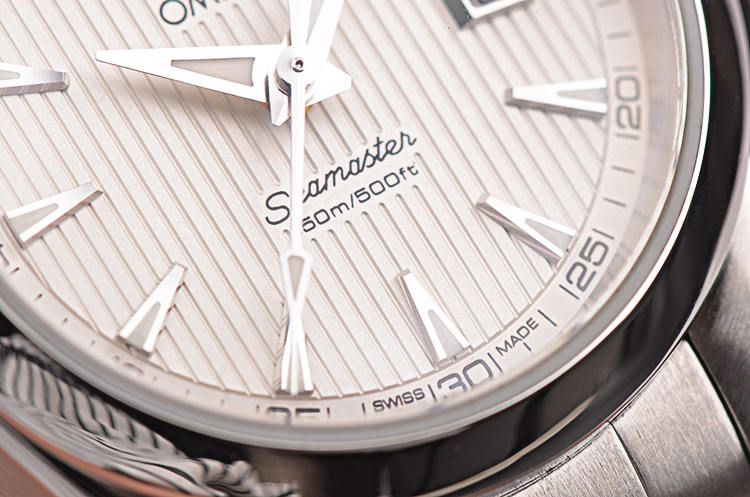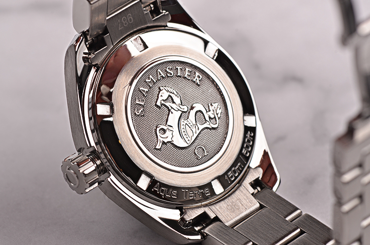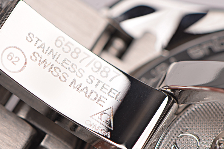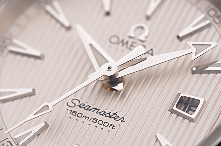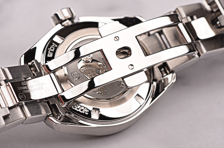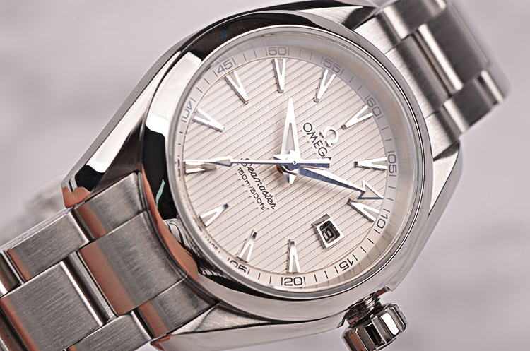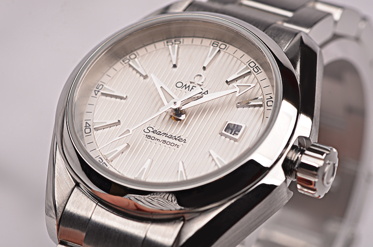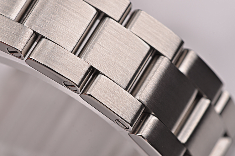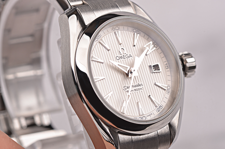 精钢表壳及链带,按压式双向折叠表扣。蓝宝石水晶镜面,银白色立体“柚木条纹”表盘,夜光指针及刻度。3点位日历显示功能。口径30MM*11.3MM。旋入式防水表把。立体“海马”印记底盖。防水150M。
