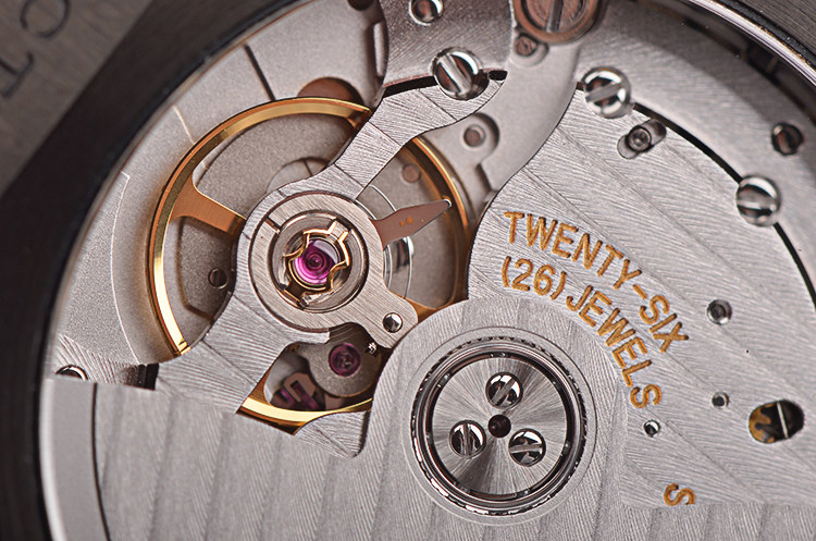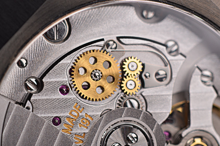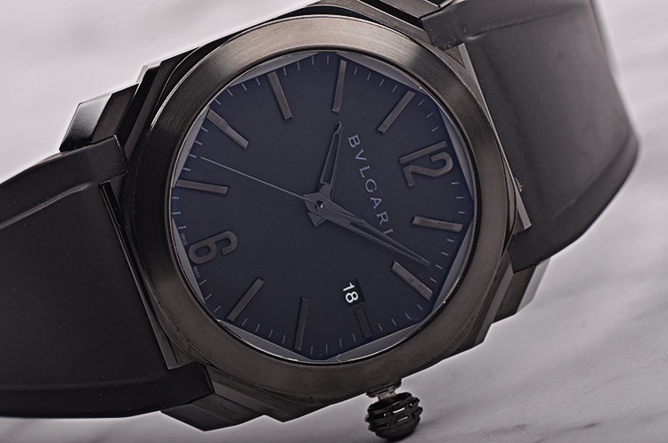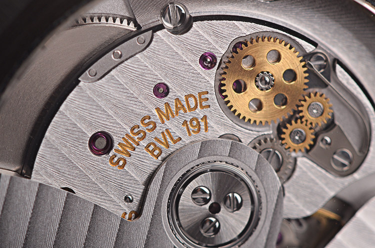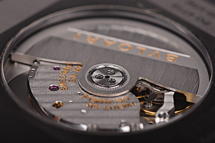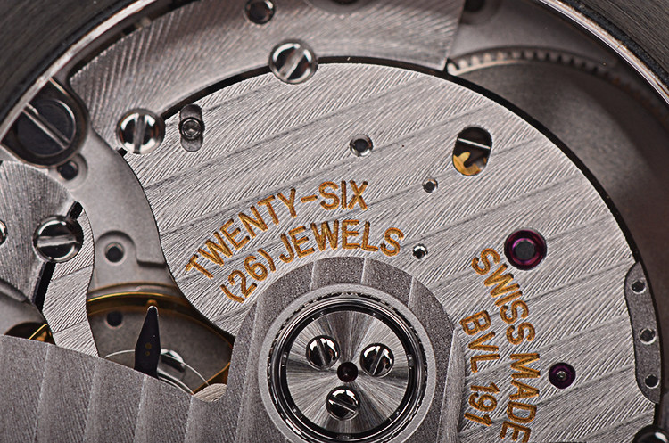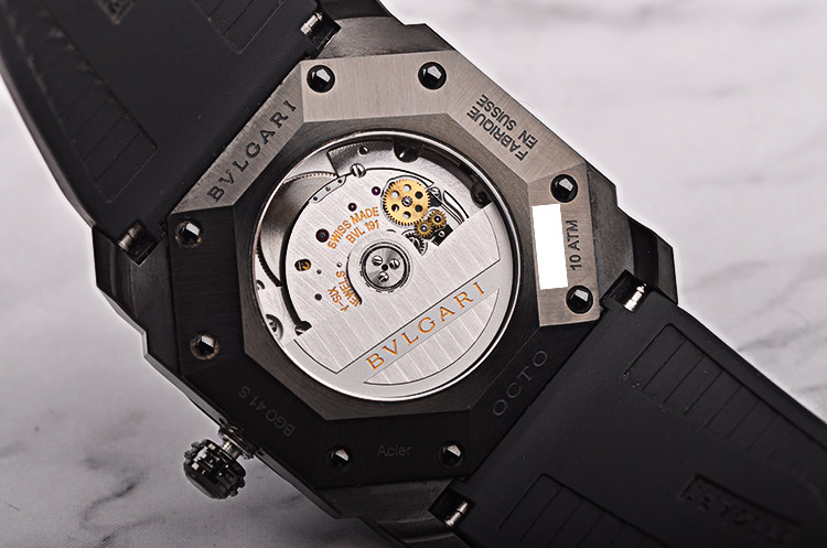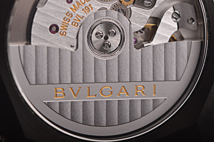 BVLGARI自产CAL.BVL191型机芯,自动机械,极其精致日内瓦条纹打磨,倒角抛光修饰。由191个零件组成,26钻,摆频28800,动力储存约42小时,走时状态极嘉。