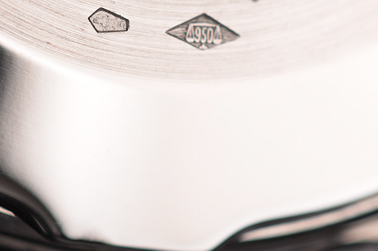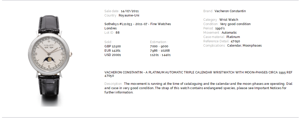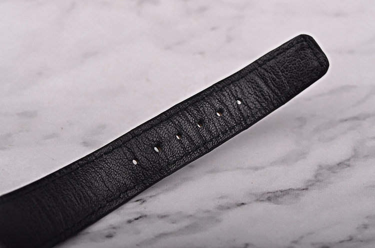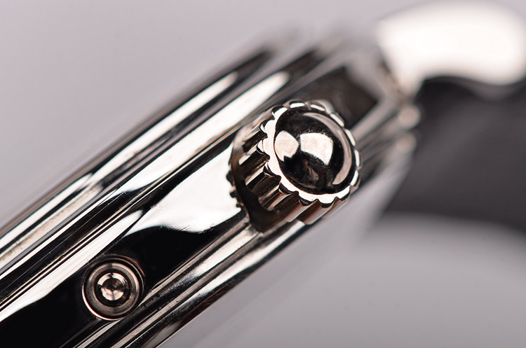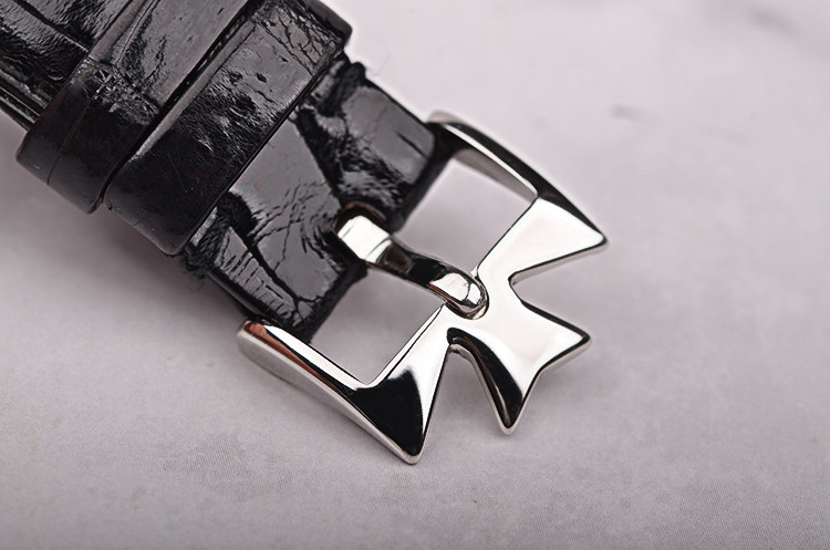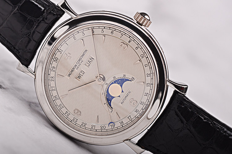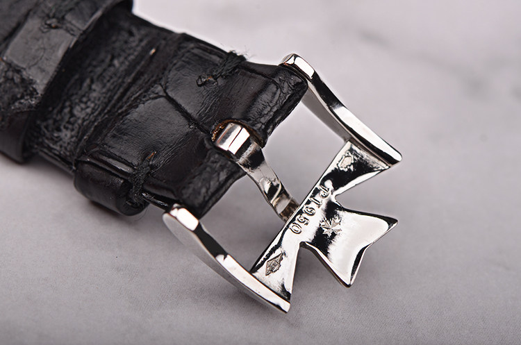PT950铂金表壳及表扣,山羊头印记。后配黑色鳄鱼皮表带成色极新。蓝宝石水晶镜面,立体银白色表盘,白金刻度及指针,12点位月份与星期显示,6点位月龄月相,月牙形日历指针,表壳侧面有对应各项功能的调校孔。口径36MM*9.9MM,防水30M。