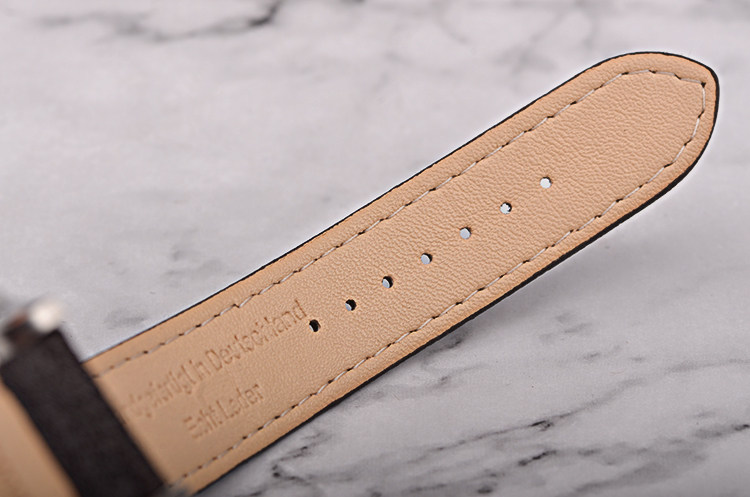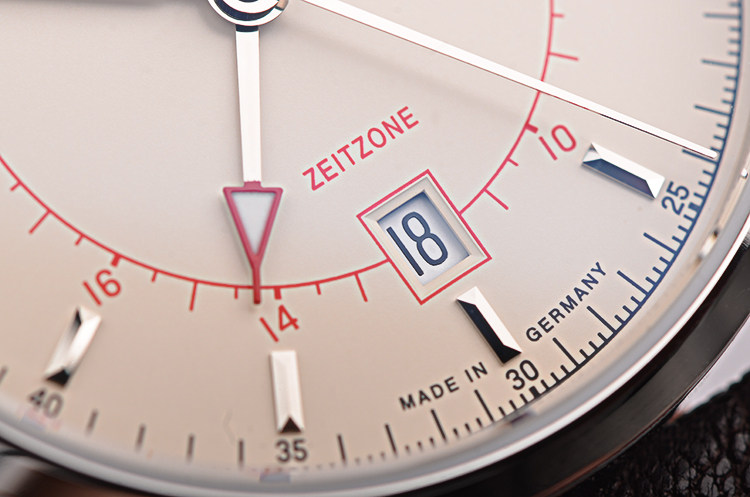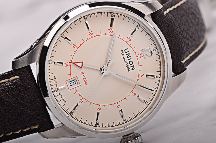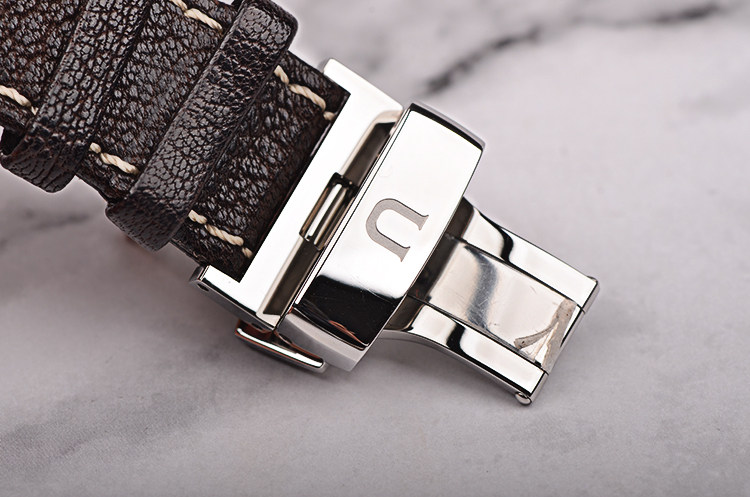 精钢表壳及按压式双向折叠表扣,深棕色小牛皮表带。蓝宝石水晶镜面及底盖,立体象牙白色表盘,时分针及红色箭头GMT指针均有夜光涂层,6点位日历显示。口径41MM*11.54MM。防水100M。