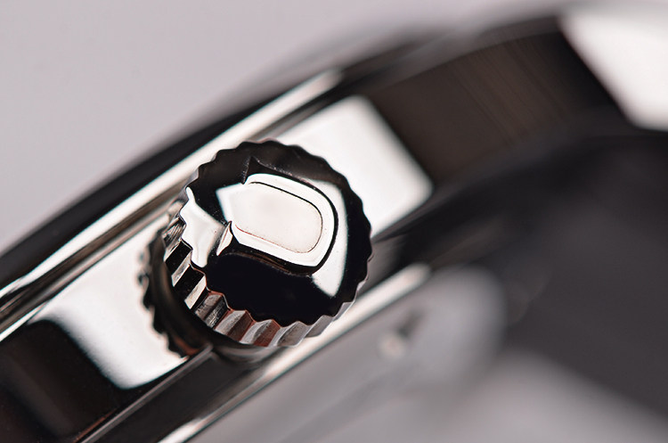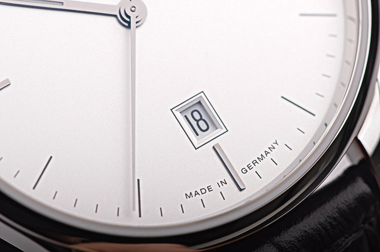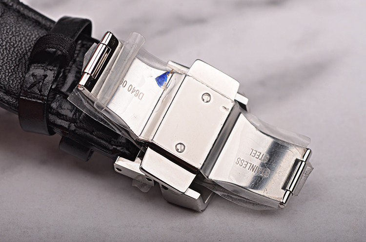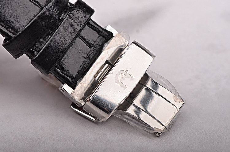 精钢表壳及按压式双向折叠表扣,黑色鳄鱼纹小牛皮表带。蓝宝石水晶镜面及底盖,立体银白色表盘,夜光时分针,6点位日历显示。口径41MM*9MM。防水100M。