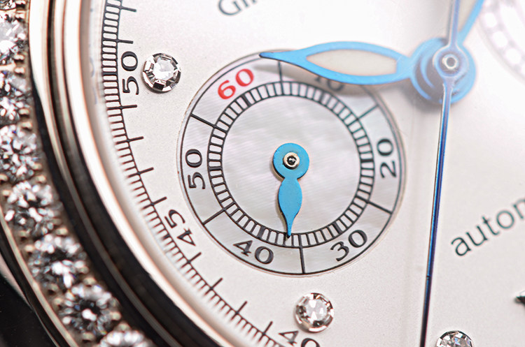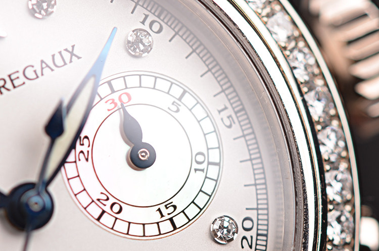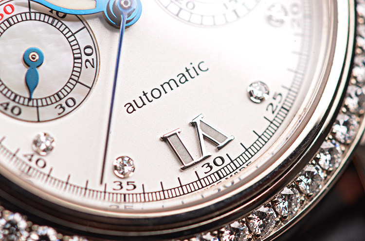 18K白金表壳及表扣,圣伯纳狗头印记。表圈原厂镶嵌48颗ding级威赛尔顿VVS级天然美钻(共计约0.96克拉),后配黑色绢丝皮带成色很新。蓝宝石水晶镜面及底盖,立体白色表盘相拼银白色珍珠贝母小秒盘和计时盘,8颗钻石时标,12点及6点位夜光白金罗马字块,蓝钢指针,时分针有夜光。3点位30分钟计时,9点位独立小秒针。口径32MM*12MM,防水30M。