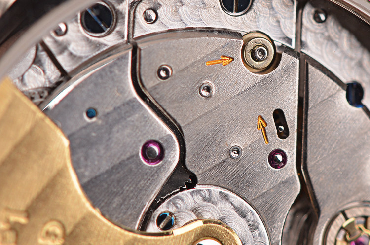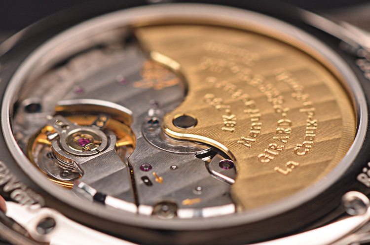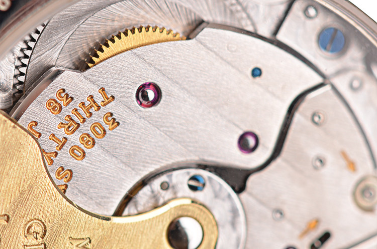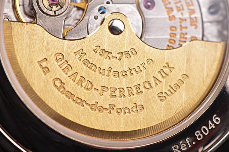 GP自产CAL.3080型机芯,自动机械,极其精致日内瓦条纹打磨,倒角抛光修饰。38钻,摆频28800,动力储存约36小时,18K黄金镌刻自动转陀,走时状态极嘉。