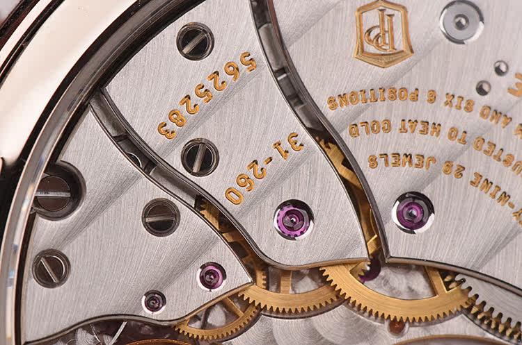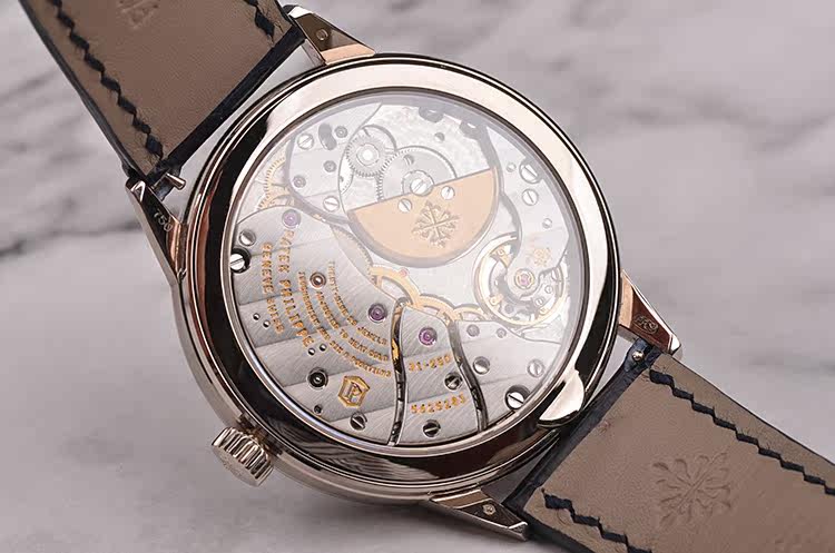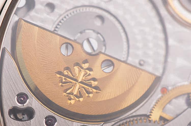 PP自产CAL.31-260 REG QA型机芯,由313个零件组成,自动机械,极其精致日内瓦条纹打磨,倒角抛光修饰。新款PP印记。29钻,6方位校正机芯,摆频21600, 22K黄金镌刻珍珠摆陀,动力储存约48小时,走时状态极嘉。