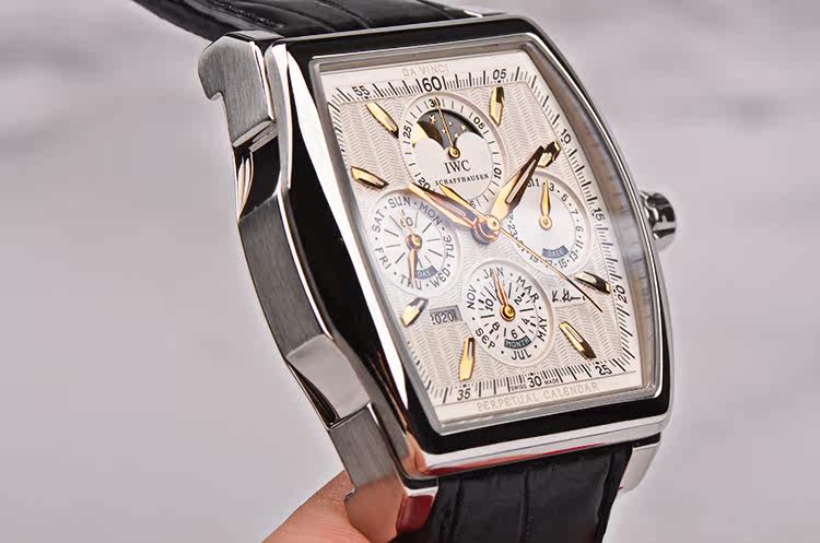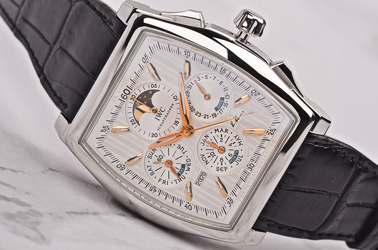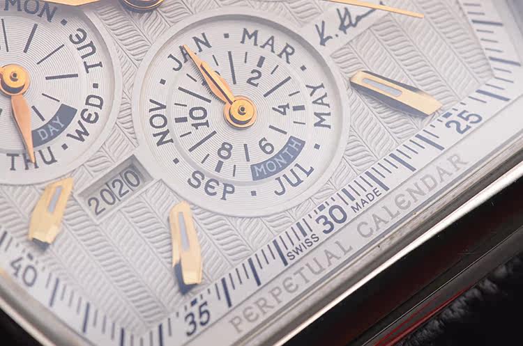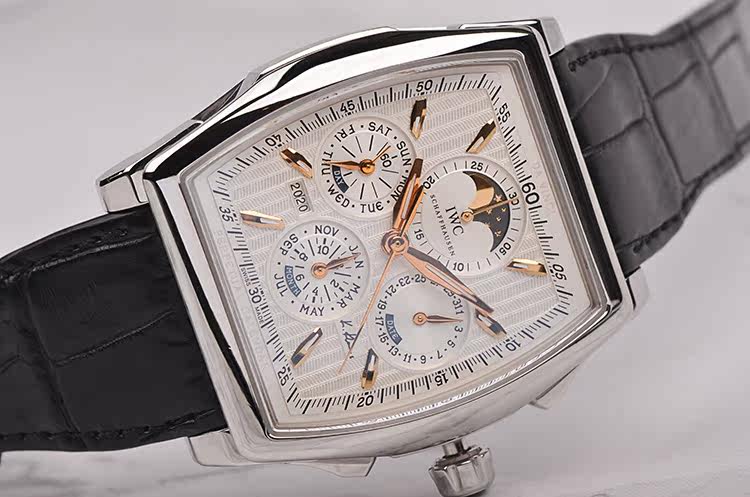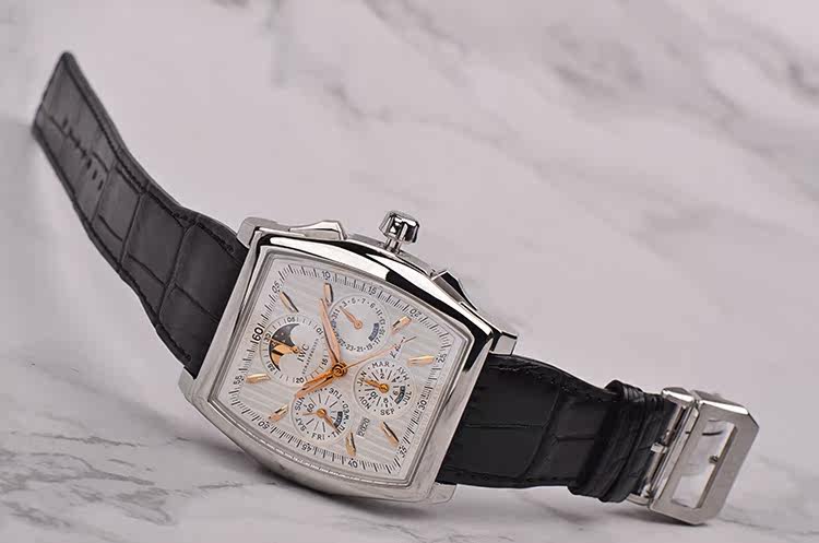 精钢表壳及折叠式表扣,全新后配黑色鳄鱼皮表带。蓝宝石水晶镜面,立体白色万年历计时表盘,玫瑰金夜光刻度及指针,12点位月相及30分钟计时,9点位星期及独立小秒针,7至8点位间数显万年历,6点位月份及12小时计时,3点位指针式日历显示。口径51MM*43MM*15.2MM,相当于圆表44MM左右大小,防水50M。