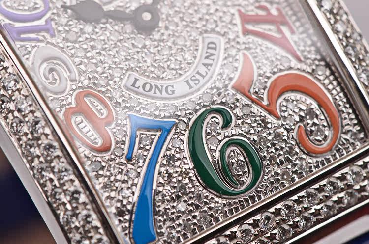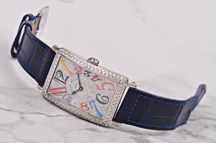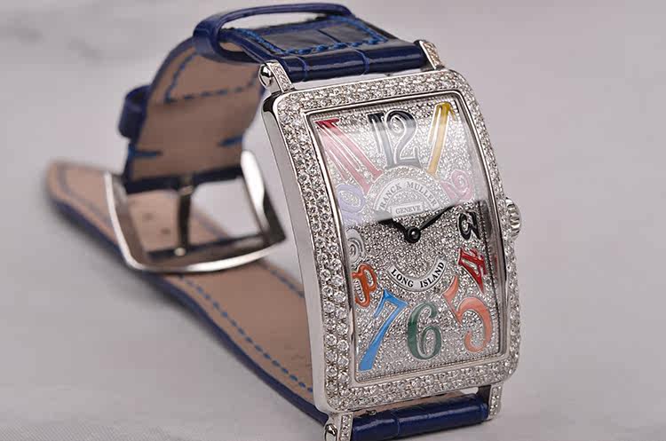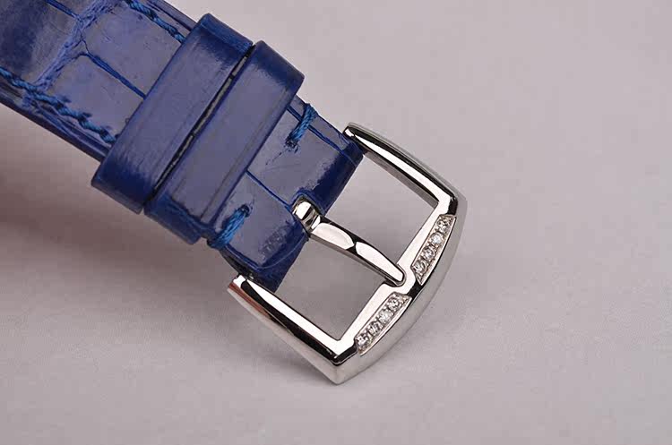 精钢表壳及表扣,表圈、表耳、表扣及表盘后镶hao华天然美钻。原装蓝色鳄鱼皮表带成色极新。蓝宝石水晶镜面,精美彩字阿拉伯数字刻度,桃心型时分针。口径44.4MM*25.9MM*7.3MM,相当于圆表36MM左右大小。防水30M。