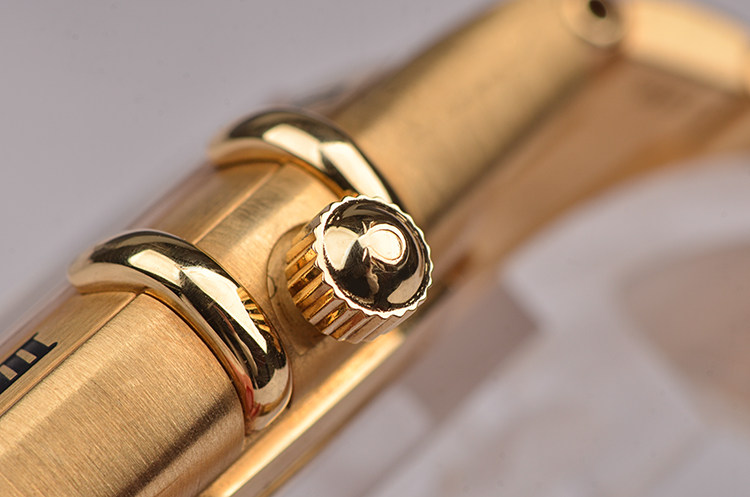 奢华18K黄金表壳及链带,18K黄金按压式折叠表扣。圣伯纳狗头印记。蓝宝石水晶镜面,18K黄金罗马数字刻度表圈,立体金色菱形格纹表盘,黄金指针,11颗钻石时标(共计约0.05克拉),3点位日历显示功能。口径35.5MM*8MM,防水50M。