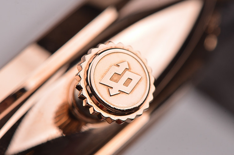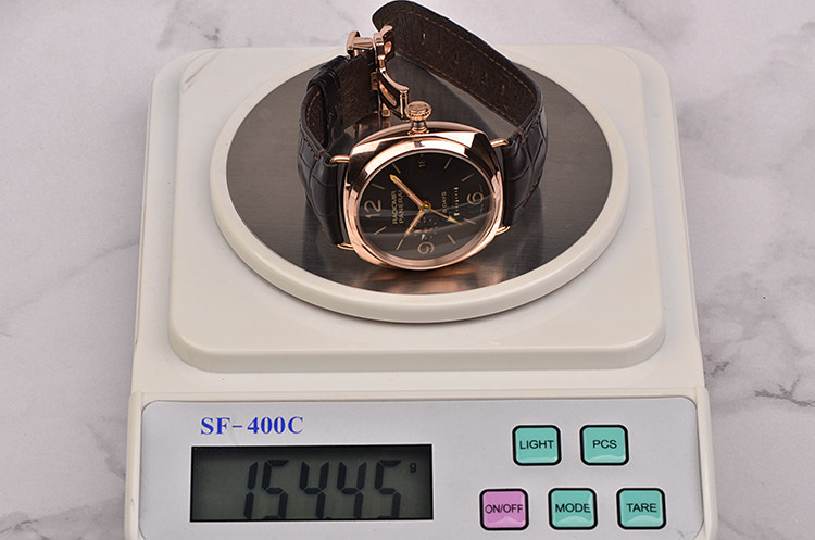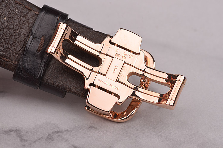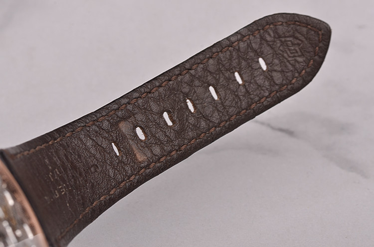 18K玫瑰金表壳及按压式双向折叠表扣,圣伯纳狗头印记。原装黑色鳄鱼皮表带成色很新。蓝宝石水晶镜面及底盖。立体深棕色三明治表盘,夜光阿拉伯数字刻度,玫瑰金夜光指针。3点位日历窗口,6点位动能储备显示,9点位第二时区昼夜显示及小秒针。旋入式防水表冠。口径45MM*14.7MM。防水50M。