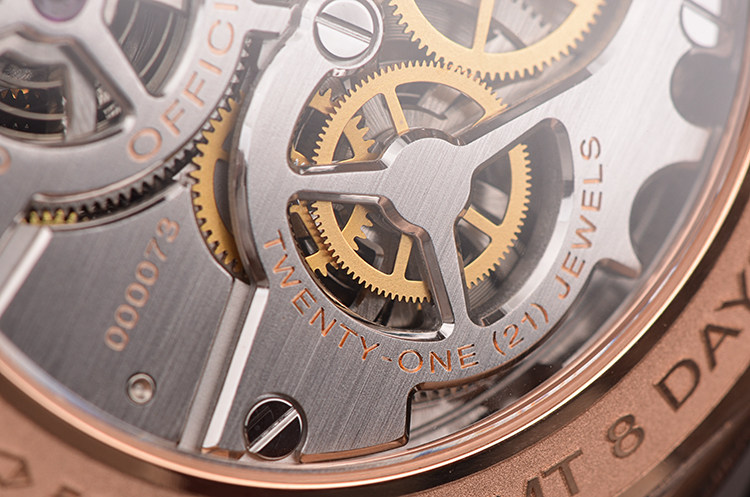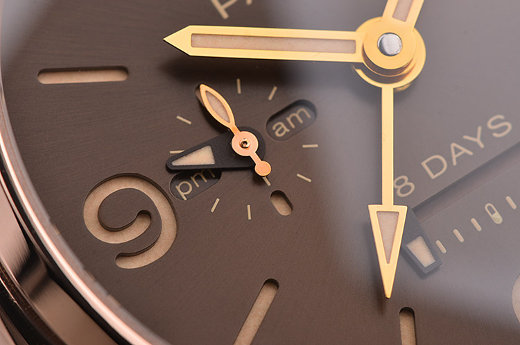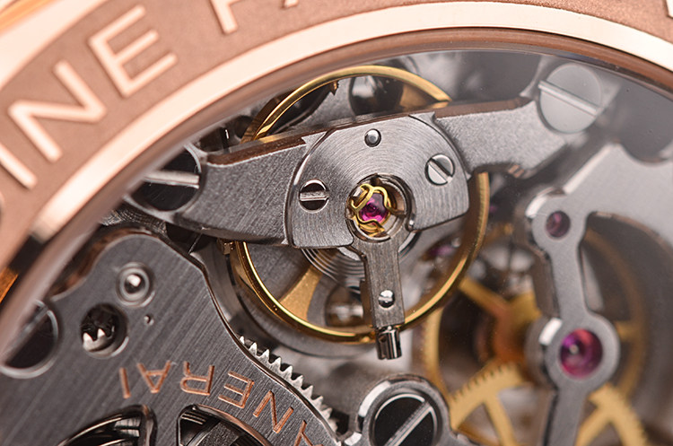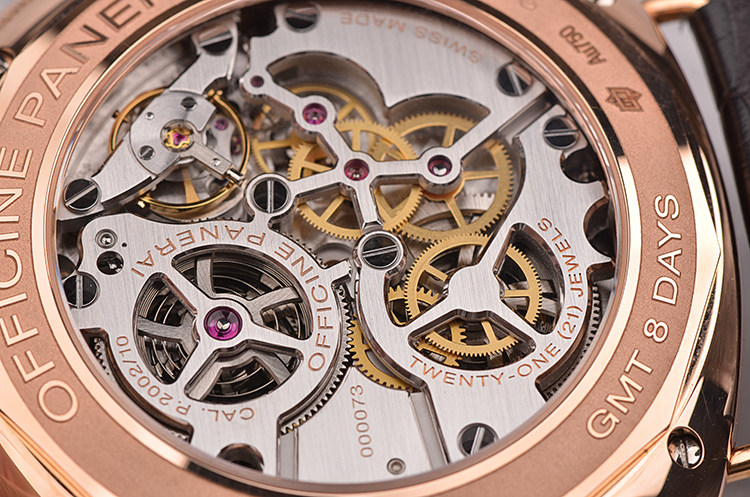 沛纳海自产CAL.P.2002/10型机芯,沛纳海高端手上链机芯,极其精致日内瓦条纹打磨,倒角抛光修饰。由246个零件组成,21钻,摆频28800,KIF避震器,动力储备约192小时,八天链。走时状态极嘉。