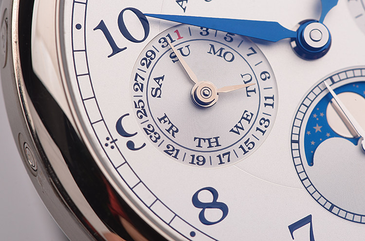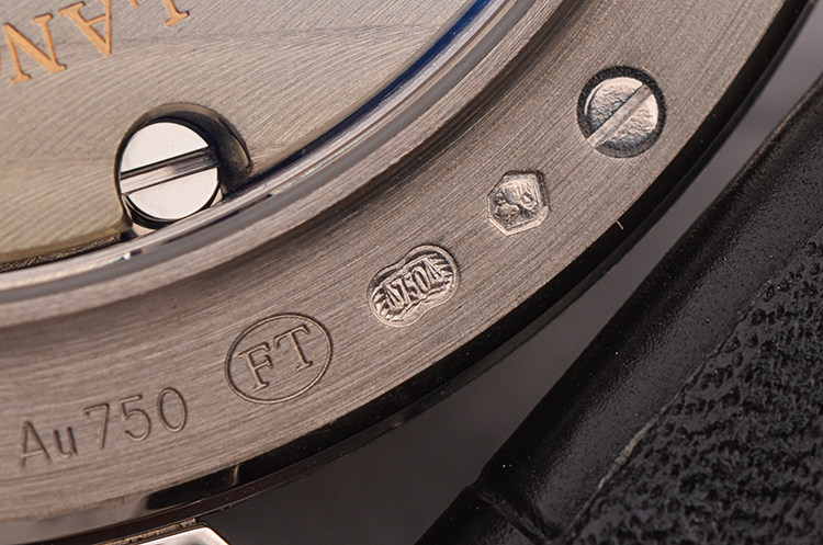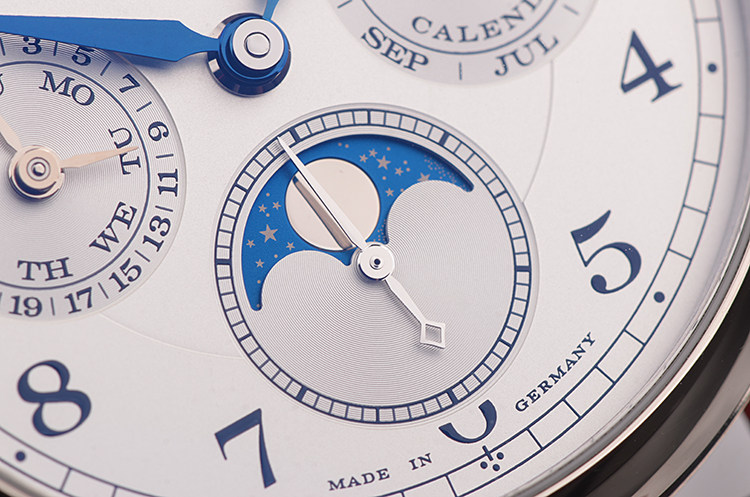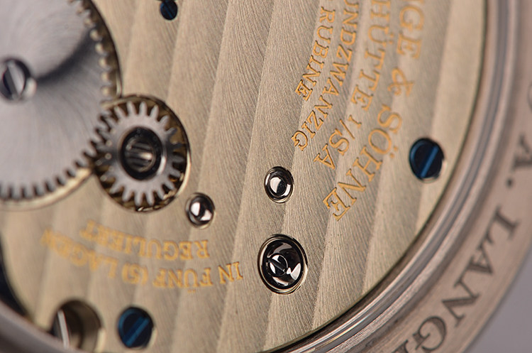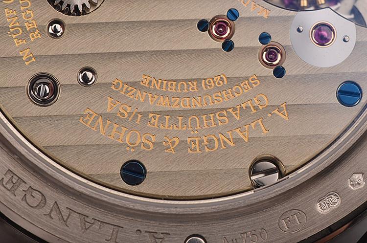 朗格自产CAL.L051.3型机芯,手上链,极其精致人手条纹打磨,倒角抛光修饰。标准德式3/4大夹板德国银机芯,人手雕花鹅颈微调,机芯独立签署。年历及月相显示,由345个零件组成,26钻,摆频21600,5方位机芯校正,动力储存约72小时(3天链),走时状态极嘉。
