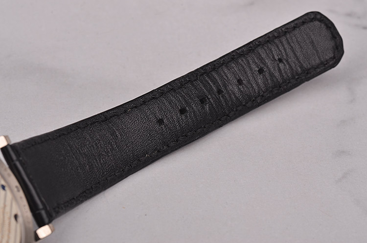 18K玫瑰金表壳及表扣,圣伯纳狗头印记。原装黑色鳄鱼皮表带成色极新。蓝宝石水晶镜面及底盖,立体银白色年历、月相表盘,9点位指针式星期及日历显示,3点位指针式月份显示,6点位独立小秒针及月相显示。口径40MM*10.1MM。防水30M。