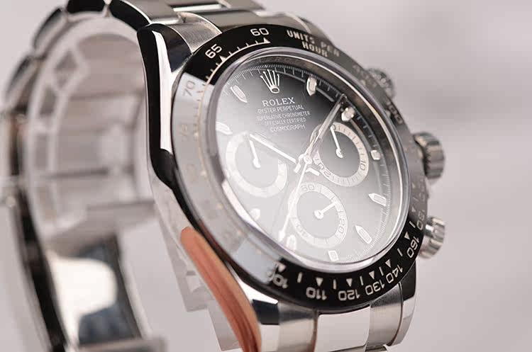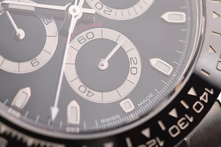 904L精钢表壳及链带,折叠式表扣,黑陶瓷测速表圈。蓝宝石水晶镜面,立体黑色计时表盘,夜光刻度及时分针,9点位12小时计时,6点位独立小秒针,3点位30分钟计时,旋入式防水表冠。口径40MM*12MM,防水100M。
