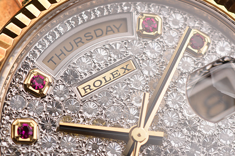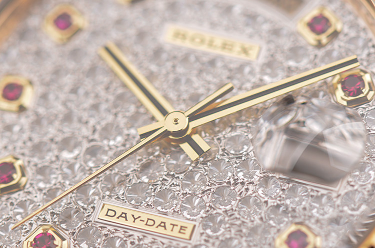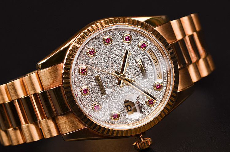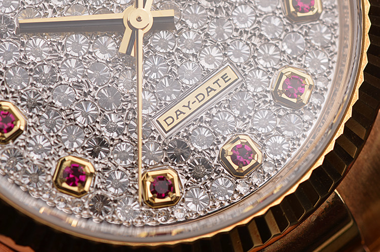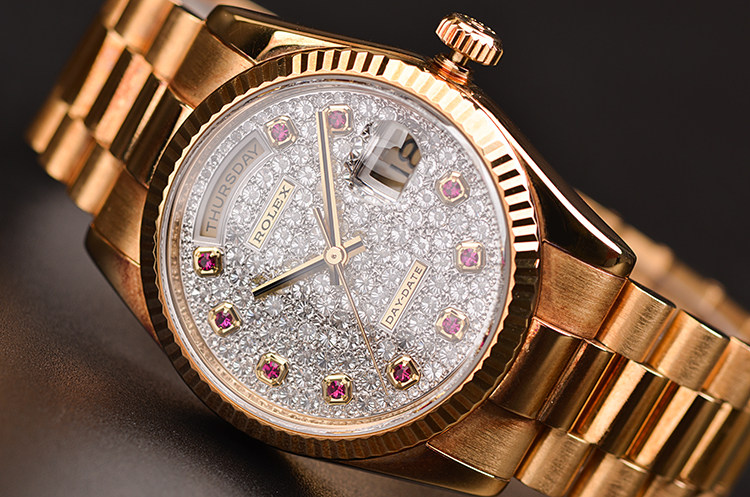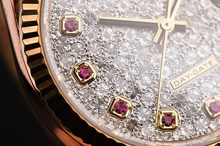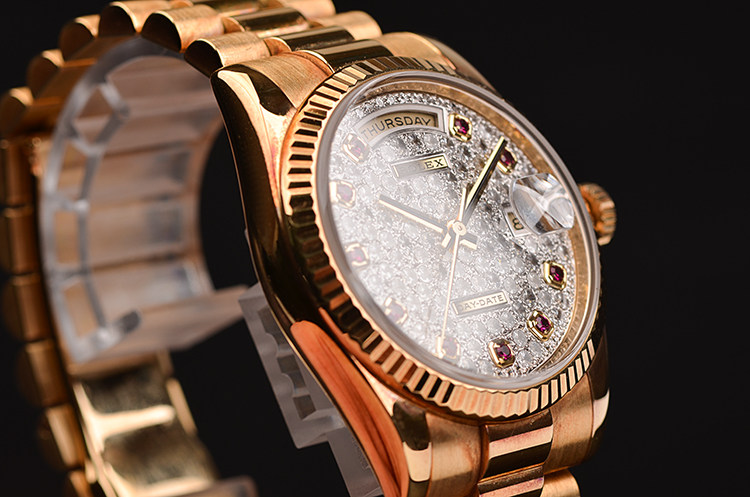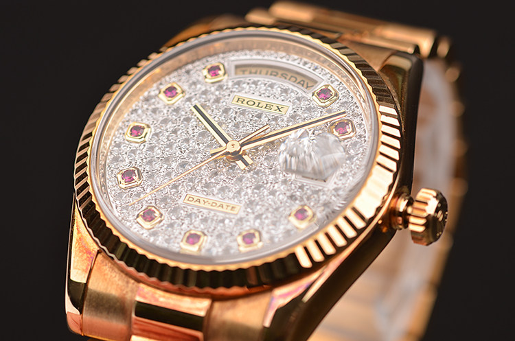 总统型星期日历全黄金密镶满天星钻石及红宝石刻度自动男表