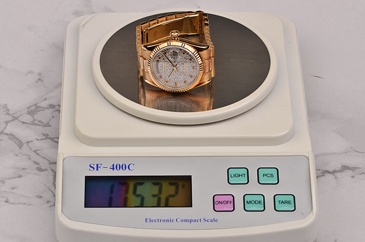18K黄金表壳及链带,18K黄金折叠式表扣,圣伯纳狗头印记。18K黄金三角坑纹表圈,原厂密镶满天星钻石表盘及红宝石刻度时标,劳力士的原厂满天星表盘制造工艺复杂,是把单颗小钻的尖角全部用专用设备切割磨平,目的是最大程度的提高表盘的闪亮及齐整程度,衬托出天然钻石的无瑕净度,又称“雪花面”。这是劳力士的独家技艺,损耗极大成本高昂,且必须依赖原厂设备,目前任何后镶钻石工艺都不可能呈现这种成品效果。12点位星期显示功能,3点位放大镜日历视窗,旋入式防水表冠。黄金黑玛瑙指针。口径36MM*12MM。防水100M。