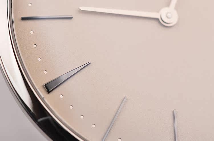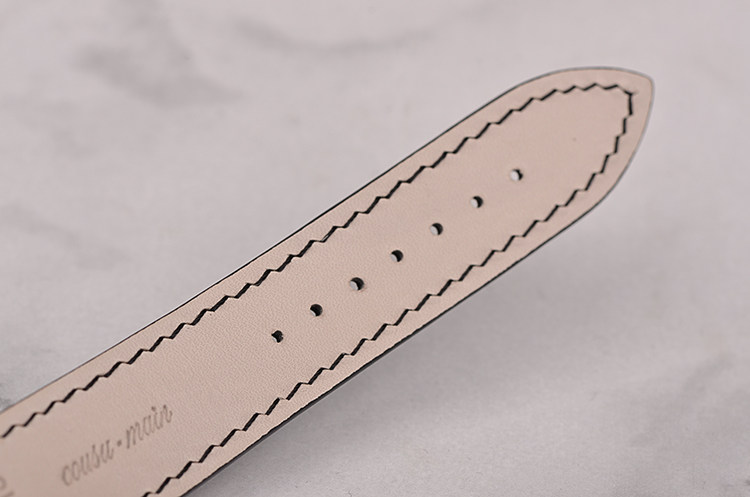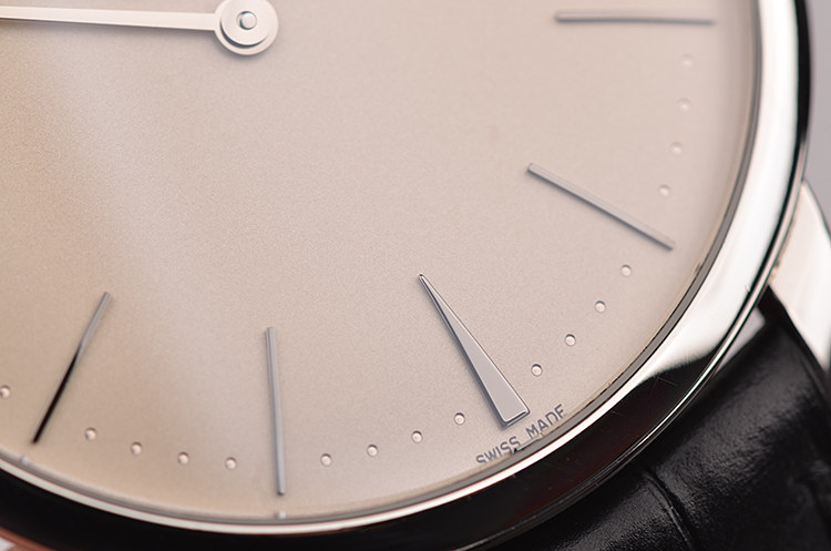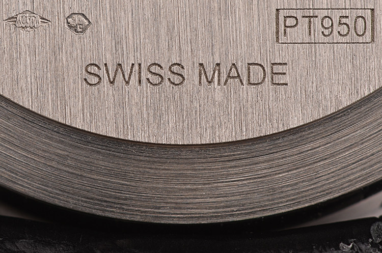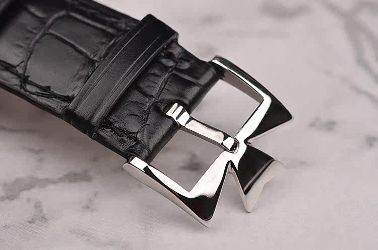 PT950铂金表壳及表扣,圣伯纳狗头印记。后配全新黑色鳄鱼皮表带。蓝宝石水晶镜面,立体乳白色磨砂表盘,白金刻度及指针,口径40MM*6.79MM,防水30M。