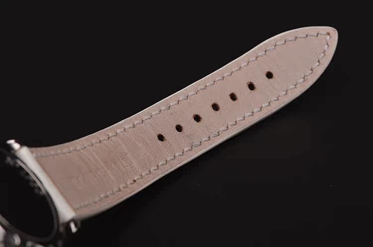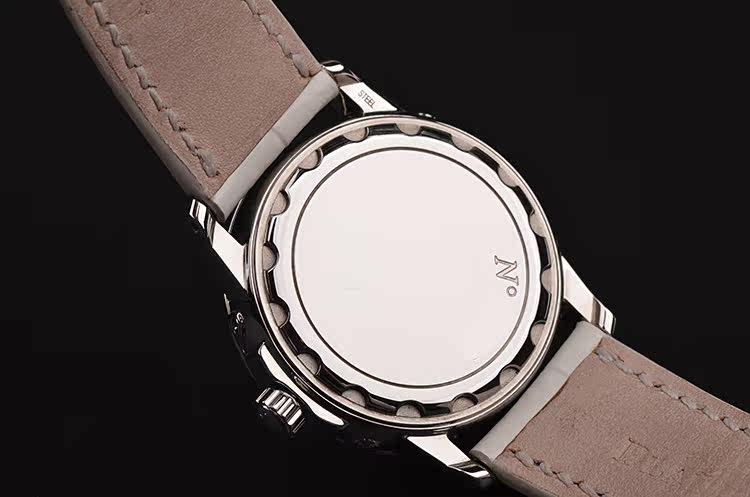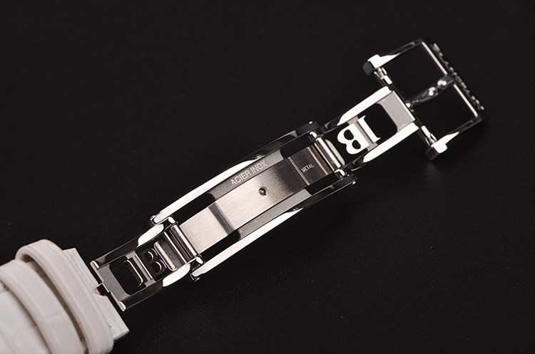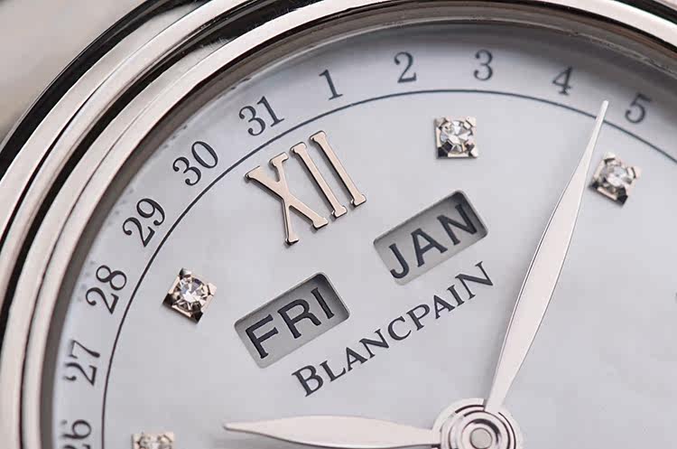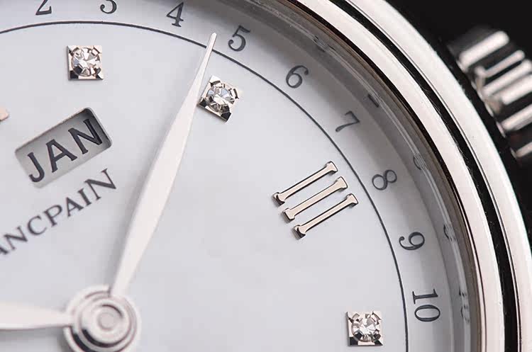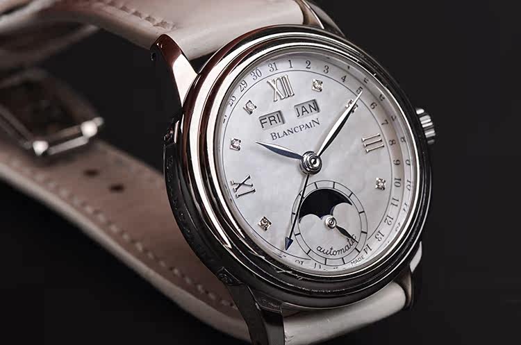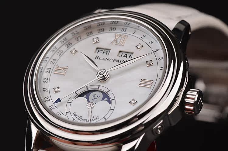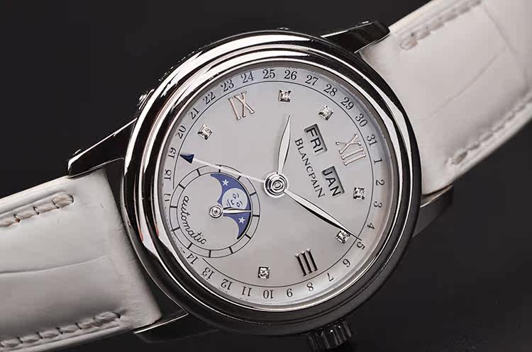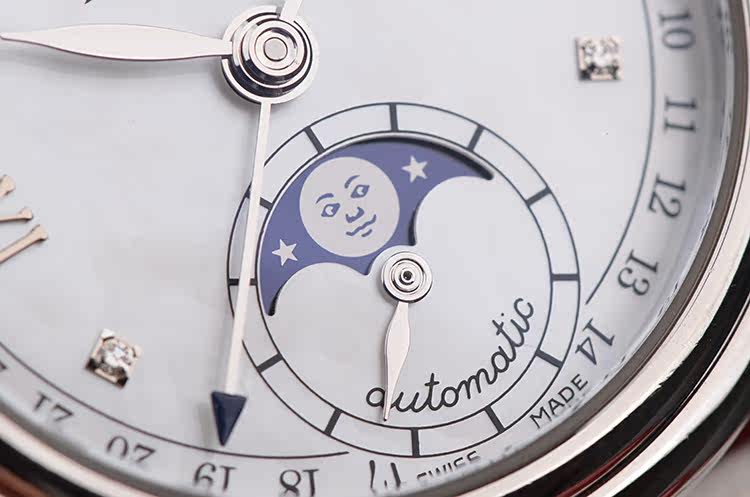 精钢表壳及折叠式弹簧表扣,后配白色鳄鱼皮表带成色很新。蓝宝石水晶镜面,立体银白色珍珠贝母全历月相表盘,刻度镶有6颗钻石,12点位星期,月份显示,6点位独立小秒针及月相功能,指针式日历显示。口径33.5MM*11.4MM。防水30M。