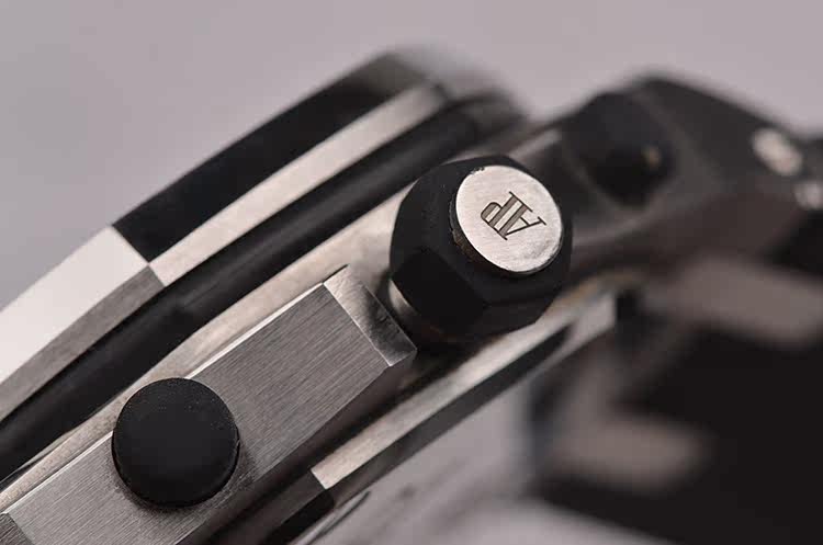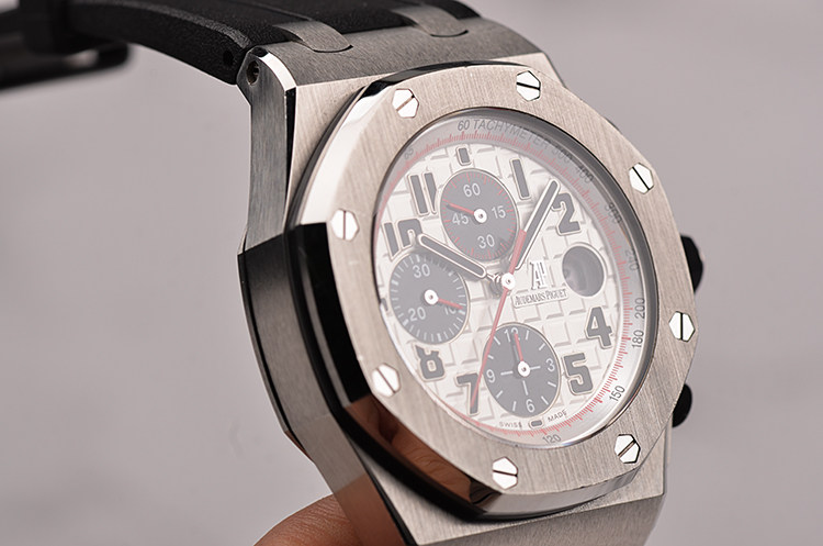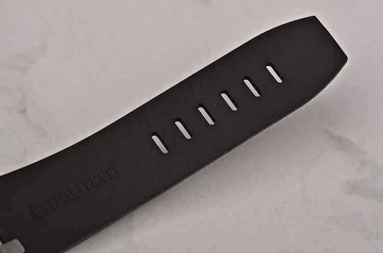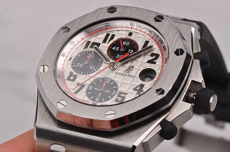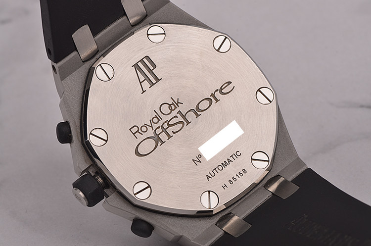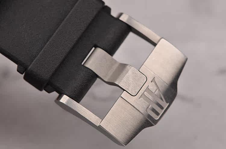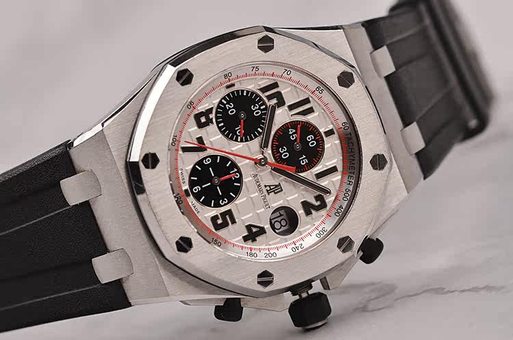 精钢八角形皇家橡树表壳及表扣,原装黑色橡胶表带成色极新,另有一条原装黑色橡胶表带及后配表扣(共计2条原装表带,一个原装表扣,一个后配表扣)。前后盖白金螺丝。蓝宝石水晶镜面,立体黑白华夫格PANDA熊猫表盘,12点位独立小秒针,9点位30分钟计时,6点位12小时计时,3点位放大镜日历视窗。旋入式防水表把。口径42MM*14.3MM。防水100M。