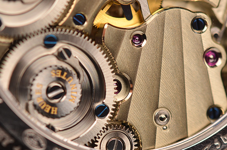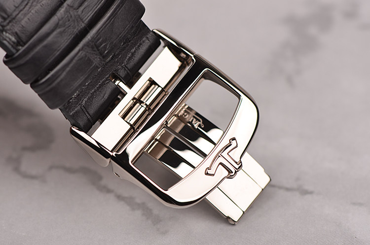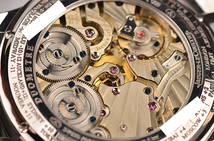 积家自产CAL.383型机芯,手上链,极其精致日内瓦条纹打磨,倒角抛光修饰。双发条盒,由高达498个零件组成,54钻,摆频28800,动力储存约50小时。走时状态极嘉。