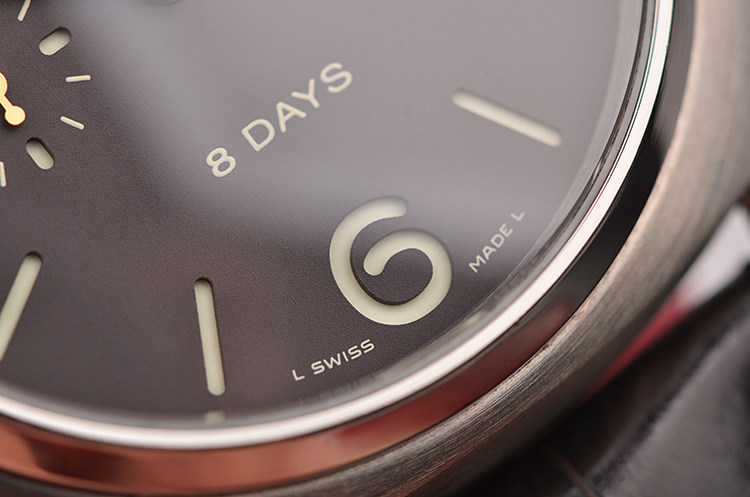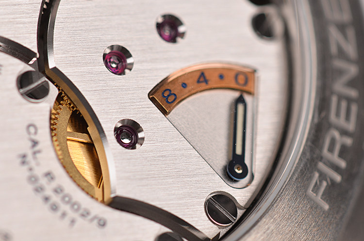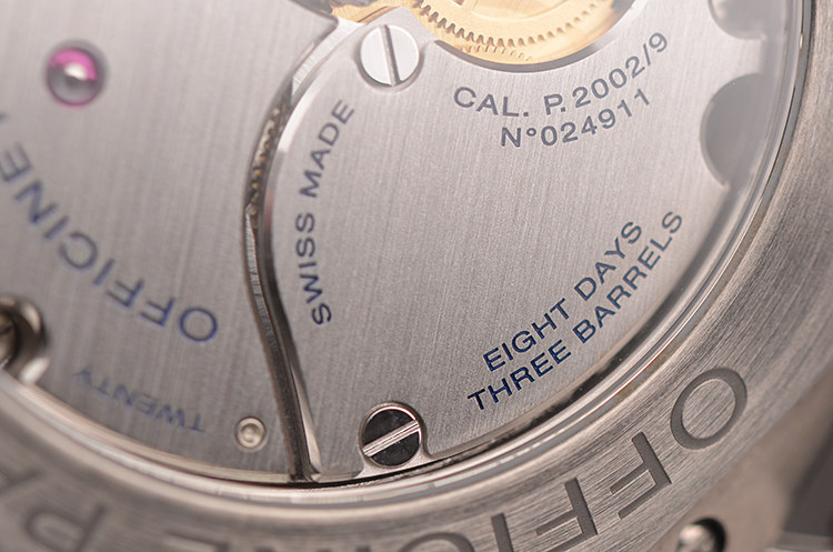 沛纳海自产CAL.P.2002/9型机芯,沛纳海高端手上链机芯,极其精致日内瓦条纹打磨,倒角抛光修饰。由245个零件组成,23钻,摆频28800,KIF避震器,指针式8天动能储备显示,走时状态极嘉。