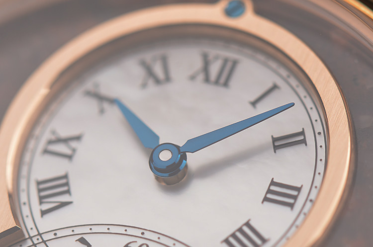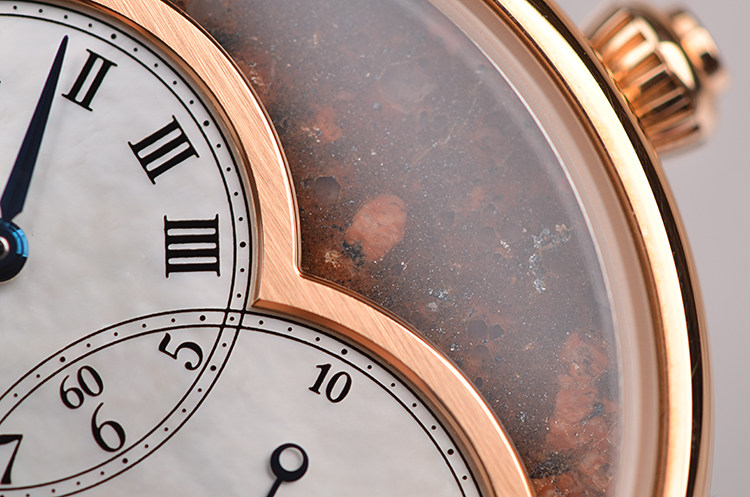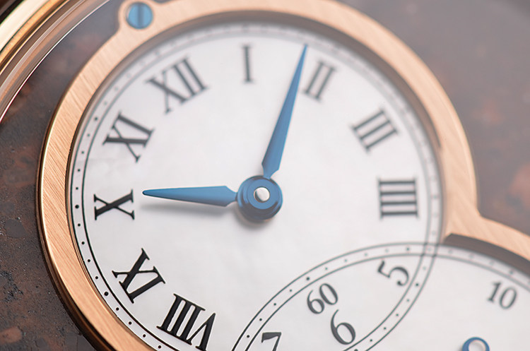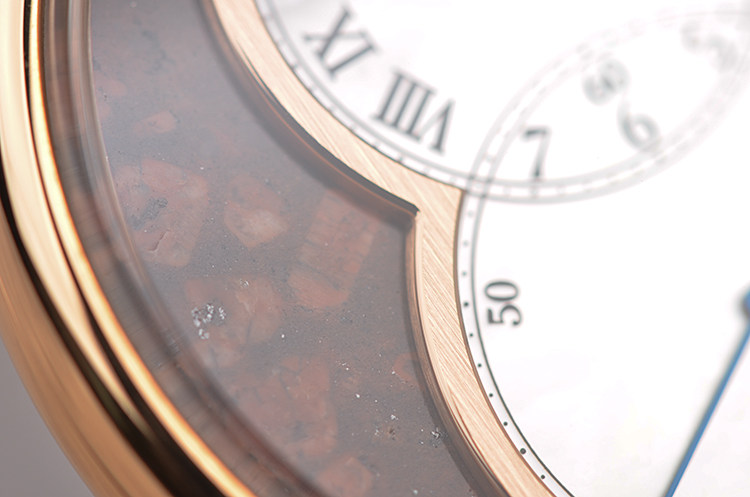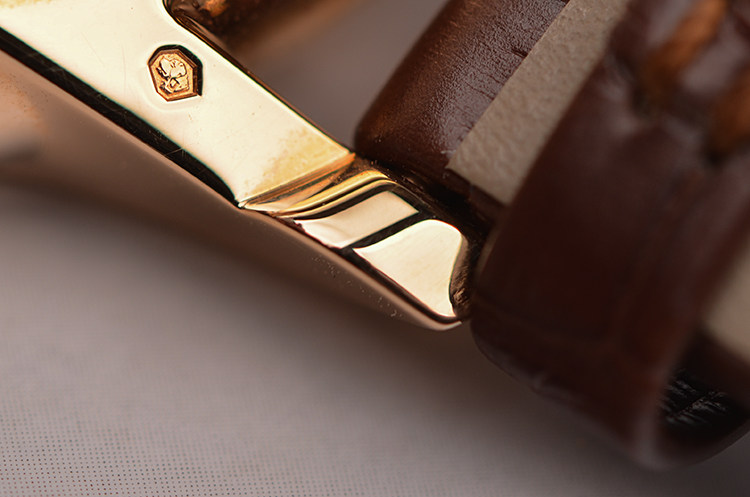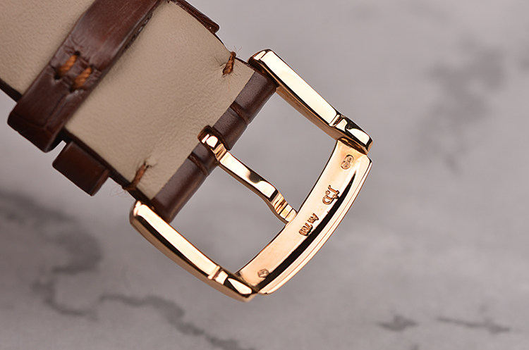 18K玫瑰金表壳及表扣,圣伯纳狗头印记。后配全新原厂棕色鳄鱼皮表带。蓝宝石水晶镜面及底盖,玫瑰金8字金环表盘,8字金环外围为棕色矿物石材质(豹纹碧玉),金环内银白色珍珠贝母面盘。蓝钢指针,罗马字刻度。口径39MM*11.8MM。防水30M。