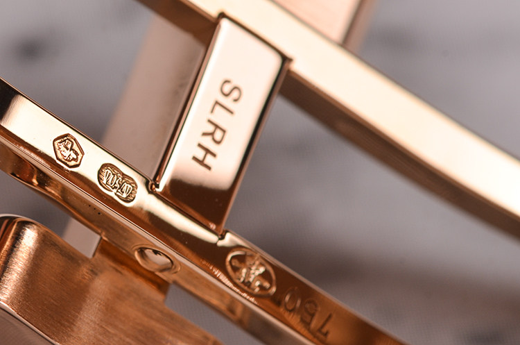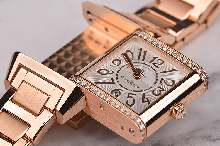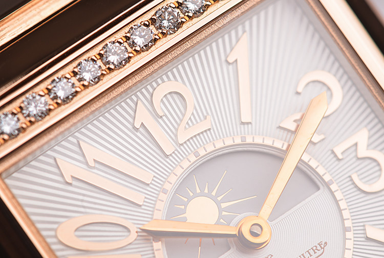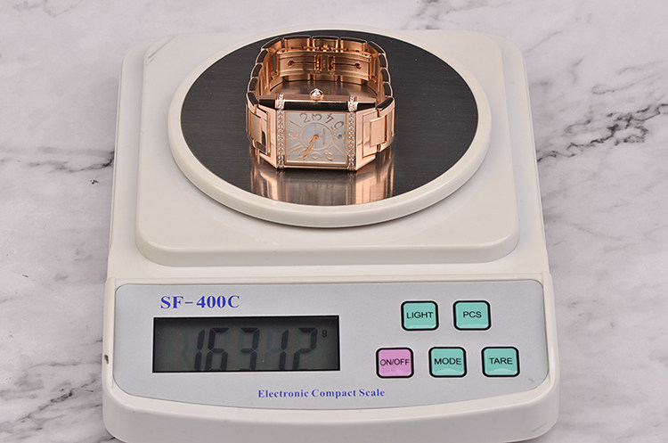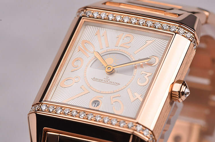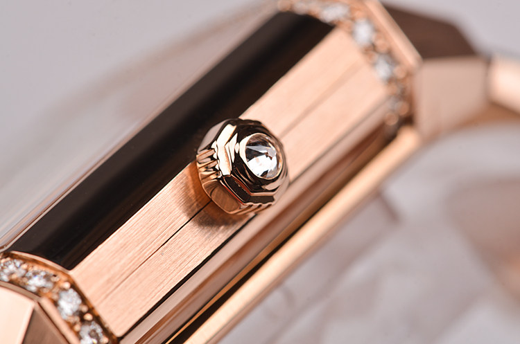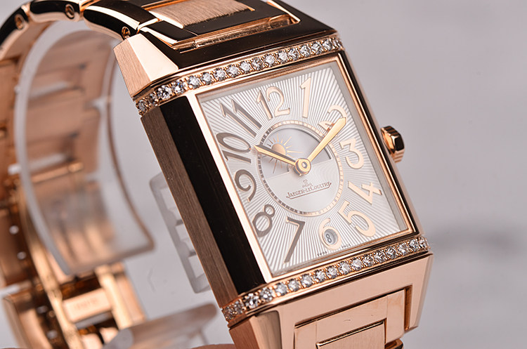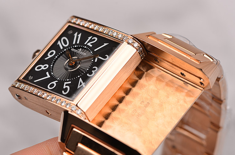 奢华18K玫瑰金表壳及链带,18K玫瑰金双向折叠表扣,圣伯纳狗头印记。表框正反两面原厂镶嵌72颗ding级赛威尔顿天然钻石,表冠镶嵌一颗大钻,VVS1级,73颗钻石共计约1.22克拉。蓝宝石水晶镜面,正面立体银白色扭索形及阳光形饰纹表盘,玫瑰金阿拉伯数字刻度及指针。12点下方日月星辰(昼夜显示功能),6点位日历窗口。背面立体黑色表盘,表盘中央自动陀外露设计,白色阿拉伯数字刻度,玫瑰金指针。口径42MM*28.8MM*11.8MM。相当于圆表37MM左右大小。防水50M。