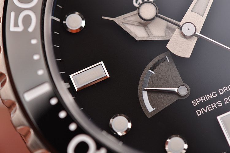 精钢表壳及链带,专利按压式潜水调节器表扣。单向可旋转计时表圈,蓝宝石水晶镜面,立体黑色表盘,夜光刻度及指针,3点位日历显示功能,7至8点位指针式动能储备显示。旋入式防水表冠。口径44.2MM*14MM。防水200M。