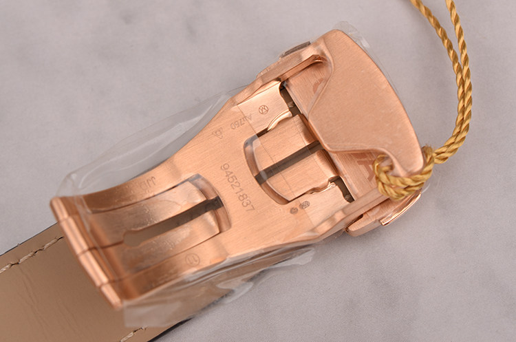 18K玫瑰金表壳及按压式折叠表扣,圣伯纳狗头印记。全新原装深棕色鳄鱼皮表带。蓝宝石水晶镜面及底盖,立体深棕色“柚木”条纹表盘,玫瑰金夜光指针及刻度,天文台认证标识,6点位日历窗口。口径43MM*14.75MM。旋入式防水表冠,防水150M。