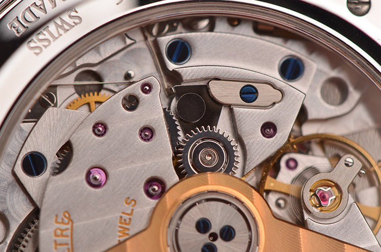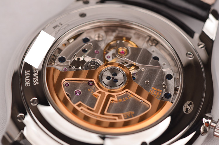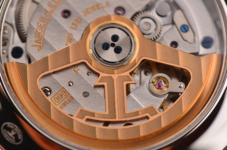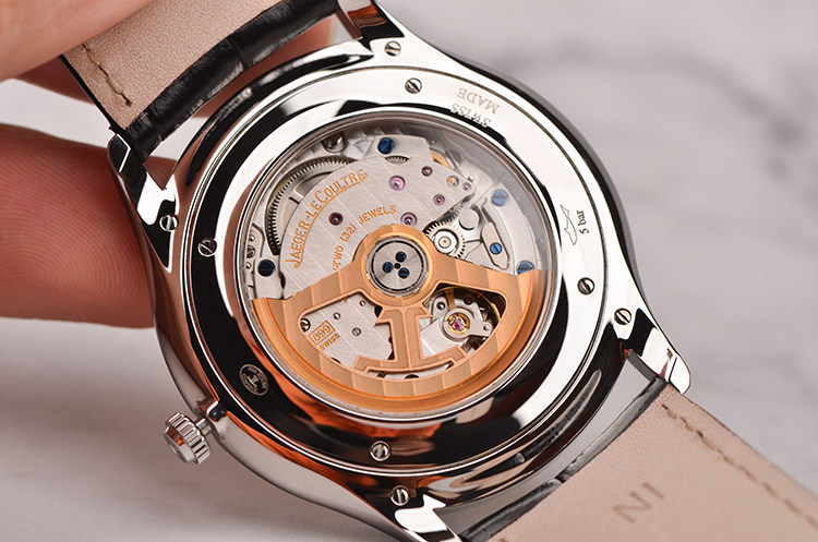 积家自产的CAL.899型机芯,自动机械,极其精致日内瓦条纹打磨,由219个零件组成,32钻,摆频28800,最新款玫瑰金镂空自动转陀,动力储存约38小时。走时状态极嘉。
