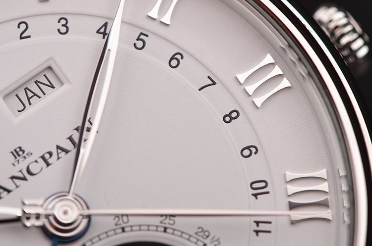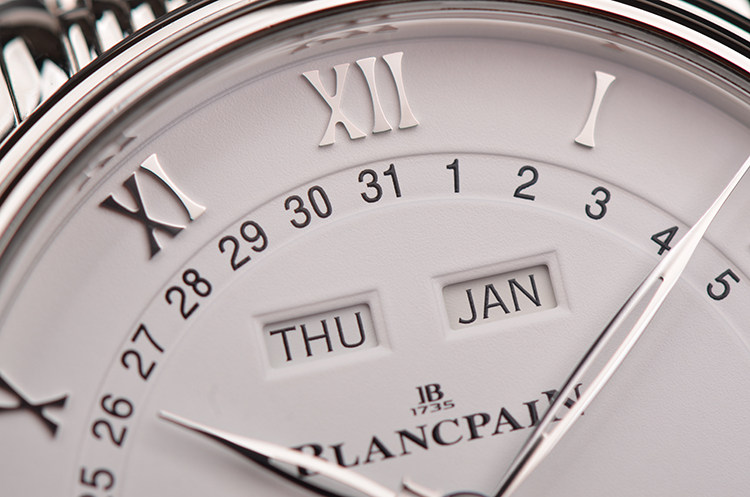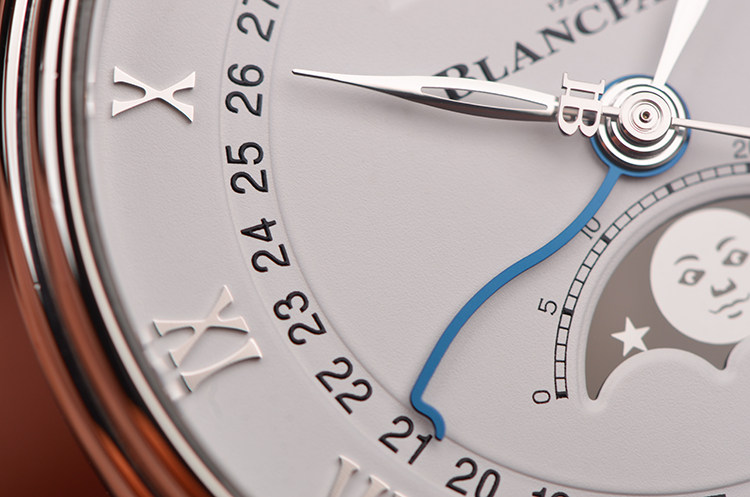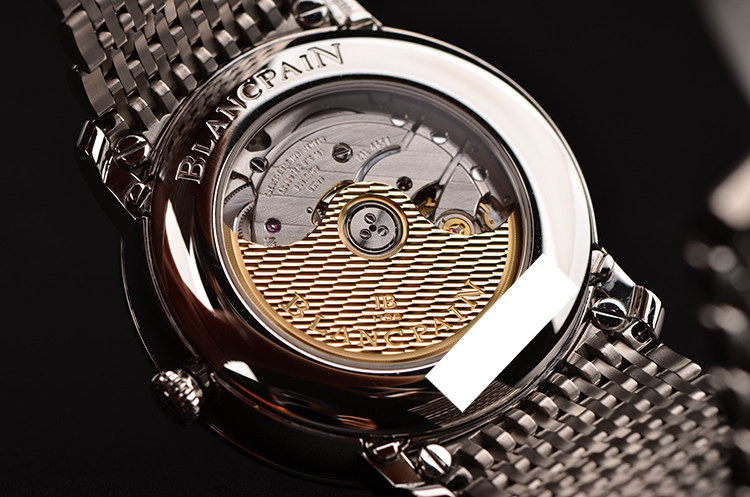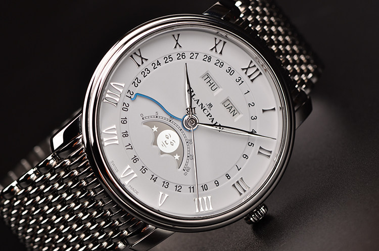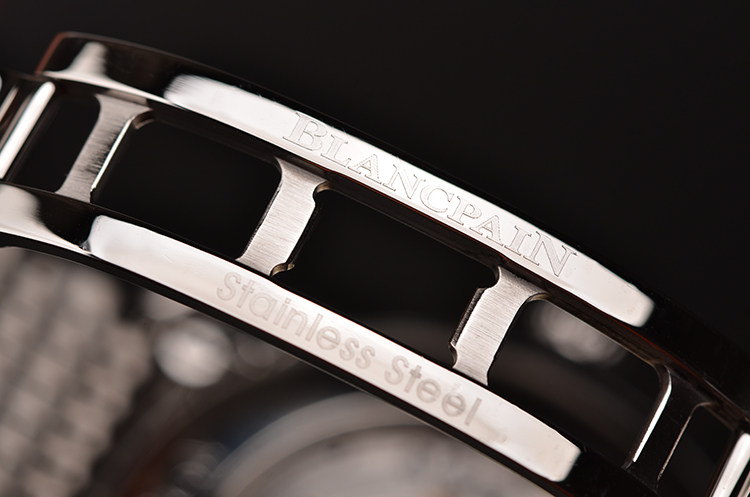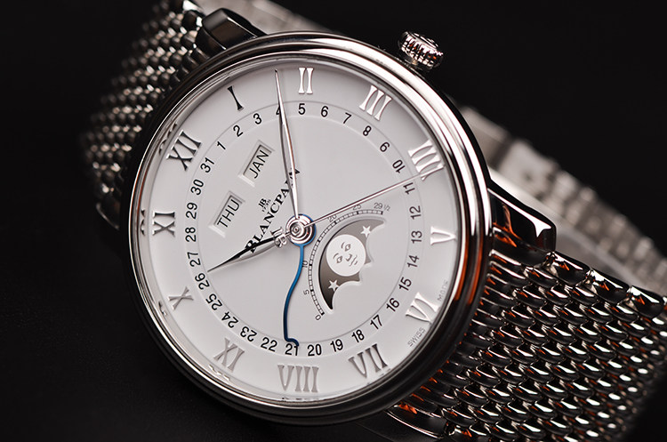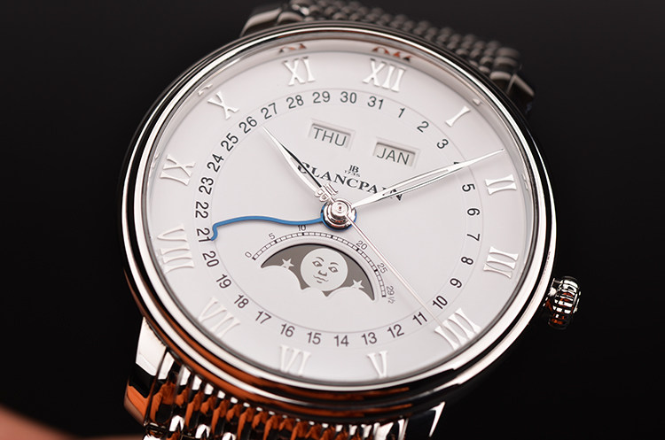 精钢表壳及编织链带,双向折叠式表扣。蓝宝石水晶镜面及底盖,立体白色表盘,柳叶时分针及古典罗马字刻度,特色的蛇形蓝钢日历针,经典的宝珀人脸月相。表背4个表耳处均有对应月份,星期,日期,月相的快调按钮。口径40MM*10.7MM。防水30M。