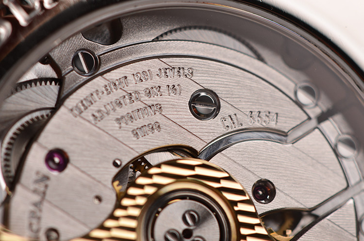宝珀自产的CAL.6654机芯,自动机械,极其精致日内瓦条纹打磨,倒角抛光修饰。月相,全历功能。由321个零件组成,28钻,6方位校正,18K黄金镌刻自动转陀,动力储存72小时(3天链)。走时状态极嘉。