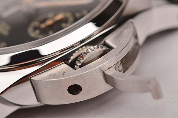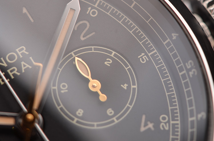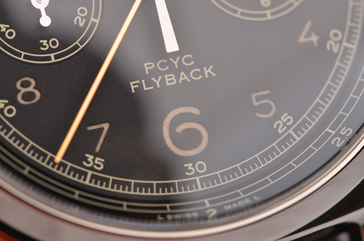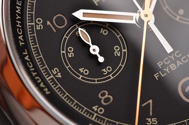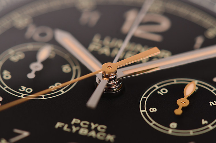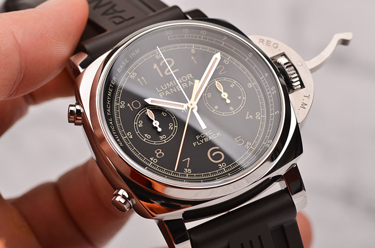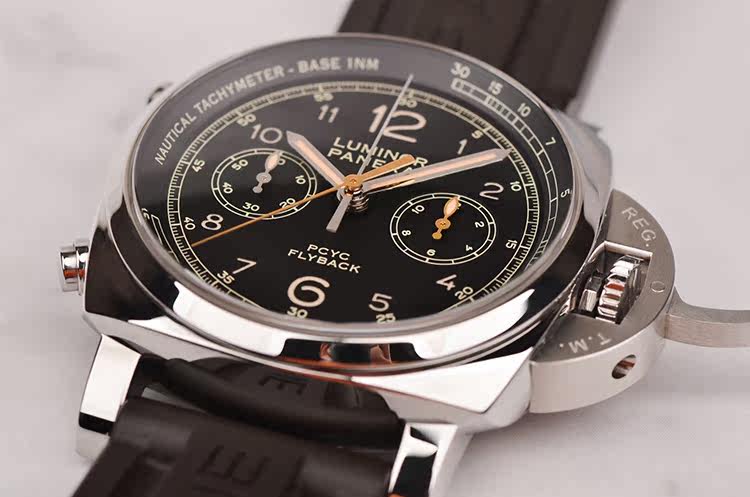 沛纳海自产P.9100型机芯,飞返计时自动机械,极其精致日内瓦条纹打磨,倒角抛光修饰,由302个零件组成,双发条盒,37钻,摆频28800,动力储存约72小时,三天链。走时状态极嘉。