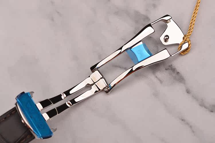 精钢表壳,18K玫瑰金表圈,圣伯纳狗头印记。精钢按压式折叠表扣,全新原装深棕色鳄鱼皮表带。蓝宝石水晶镜面及底盖,立体银白色“柚木”条纹表盘,玫瑰金夜光指针及刻度,天文台认证标识,大三针设计,3点位日历显示窗口。口径38.5MM*13.3MM。玫瑰金旋入式防水表冠,防水150M。