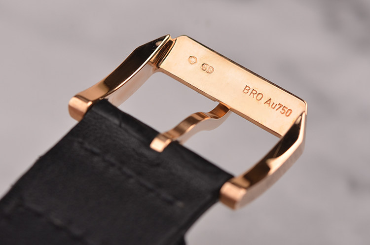 18K玫瑰金表壳及表扣,圣伯纳狗头印记。原厂黑色鳄鱼皮表带未使用成色。蓝宝石水晶镜面,立体黑灰双色计时表盘,金质指针及阿拉伯数字刻度,12点位30分钟计时,6点位独立小秒针。口径40.9MM*12.3MM。防水30M。