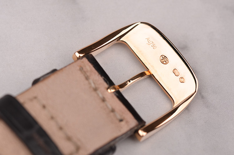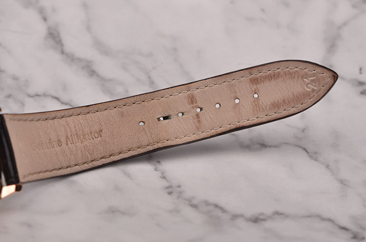 18K玫瑰金表壳及表扣,圣伯纳狗头印记。原装深棕色鳄鱼皮表带正常使用成色。表框后镶hao华天然美钻,蓝宝石水晶镜面及底盖,立体象牙白色表盘,玫瑰金刻度及时分针,蓝钢长秒针,6点位指针式日历及月相功能。口径39MM*9.9MM。防水50M。