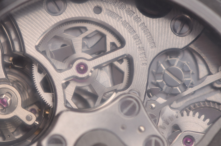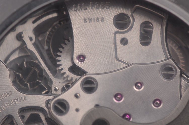 JB自产CAL.F385型机芯,自动机械,飞返计时及日历功能,极其精致日内瓦条纹打磨,倒角抛光修饰。由322个零件组成,37钻,36000次高摆频,6方位校正,硅游丝,18K金自动转陀,动力储存约50小时,走时状态极嘉。